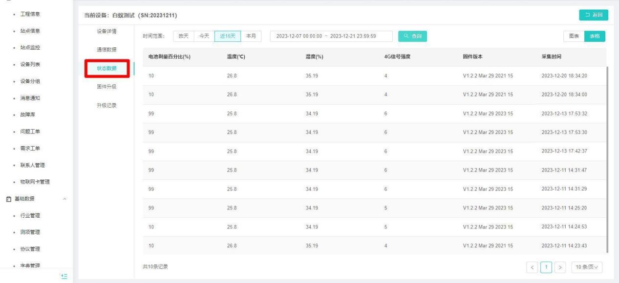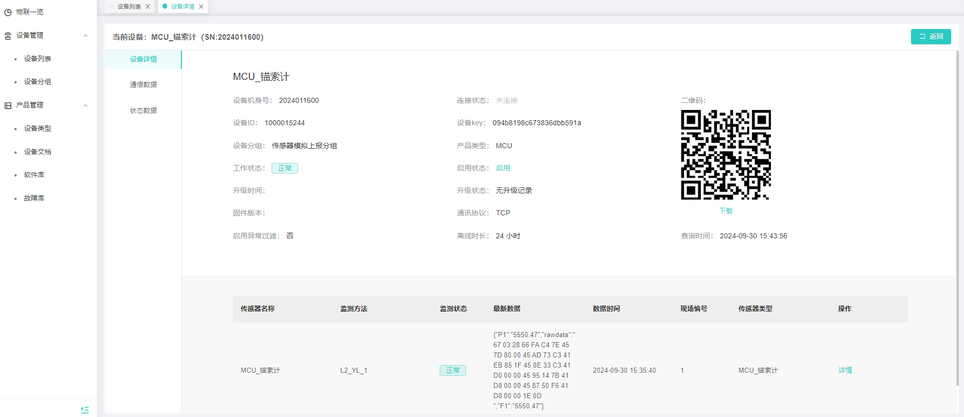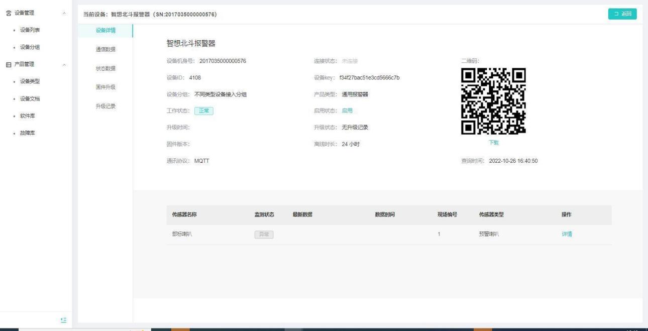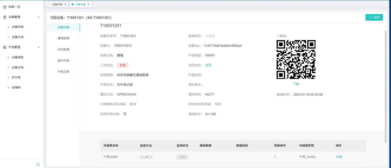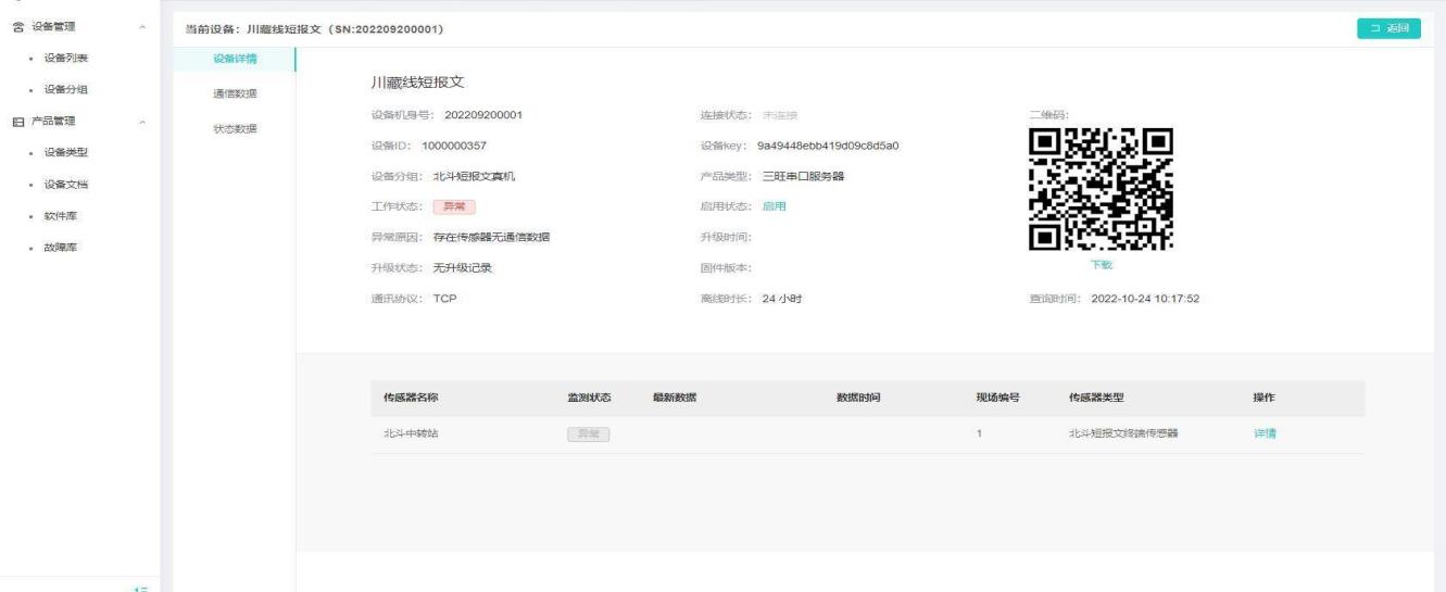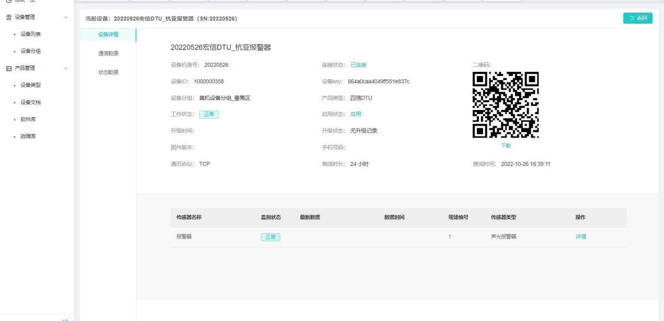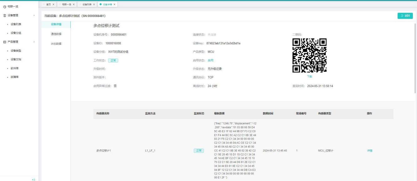 4、详情页面有5个Tab页,分别为【设备详情、通信数据、状态数据、固件升级、升级记录】