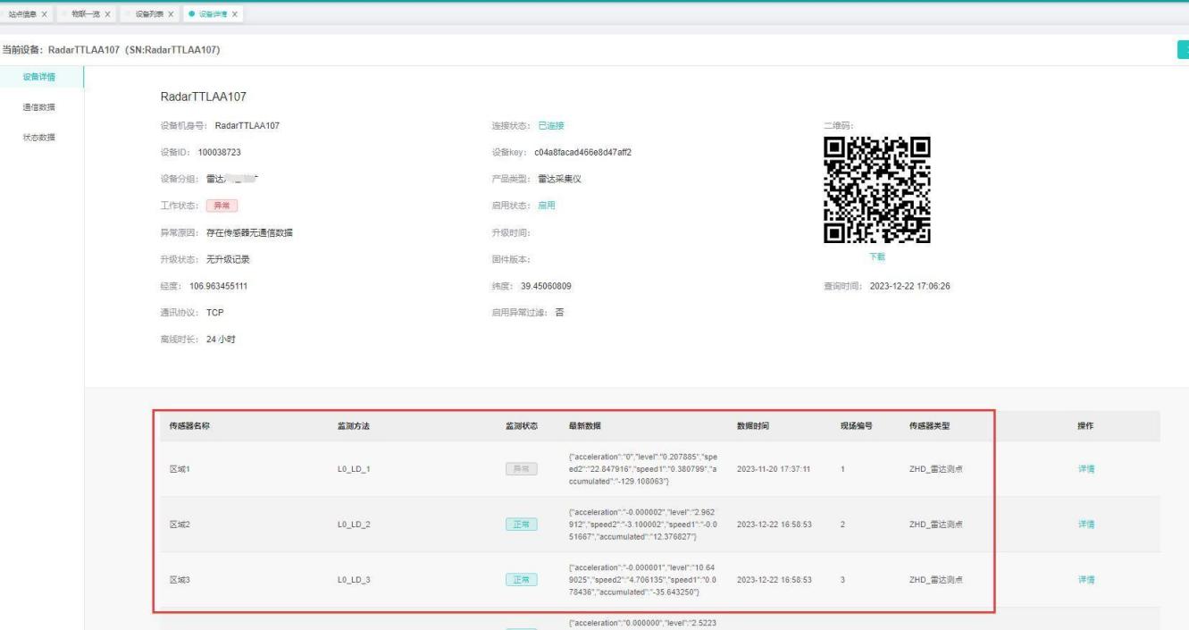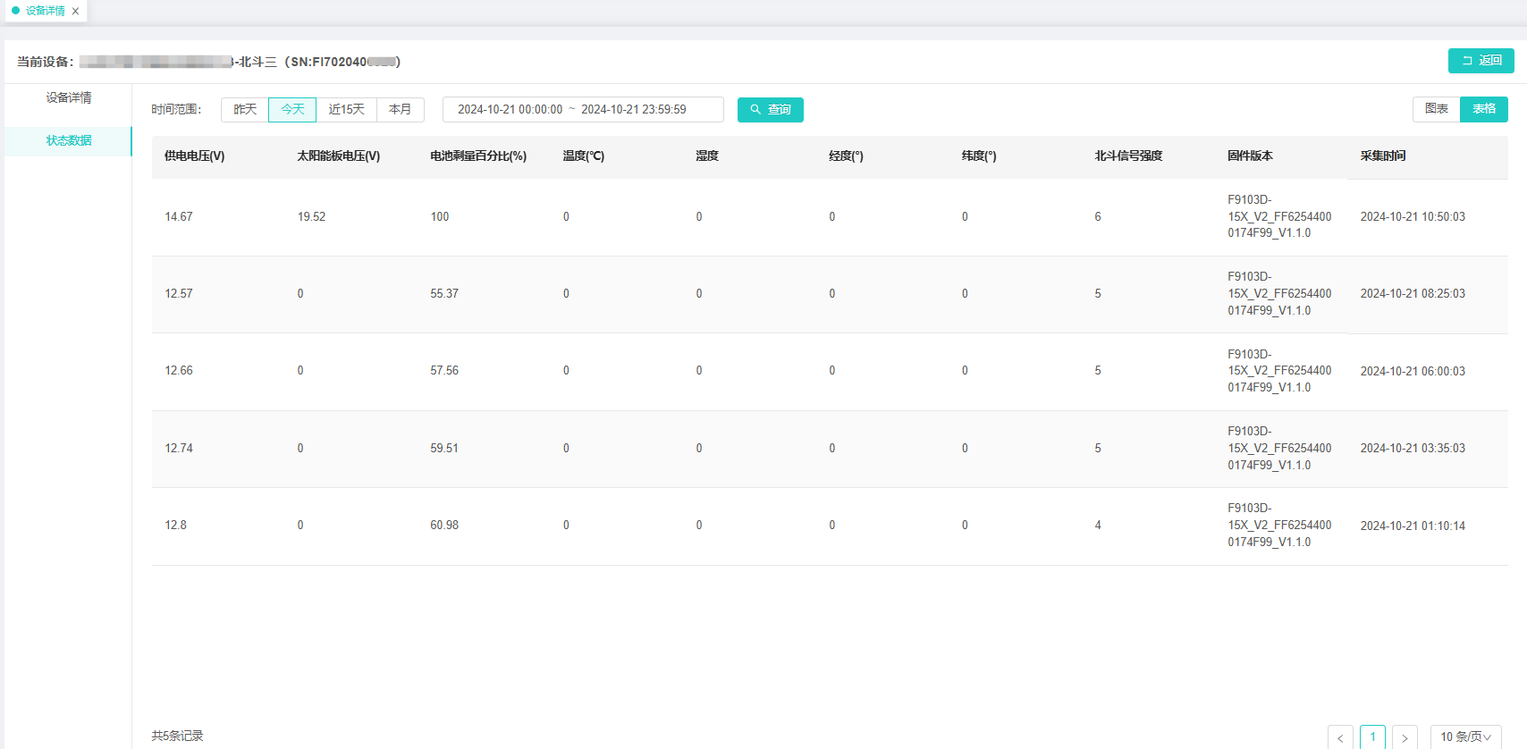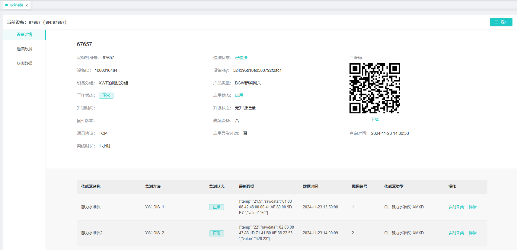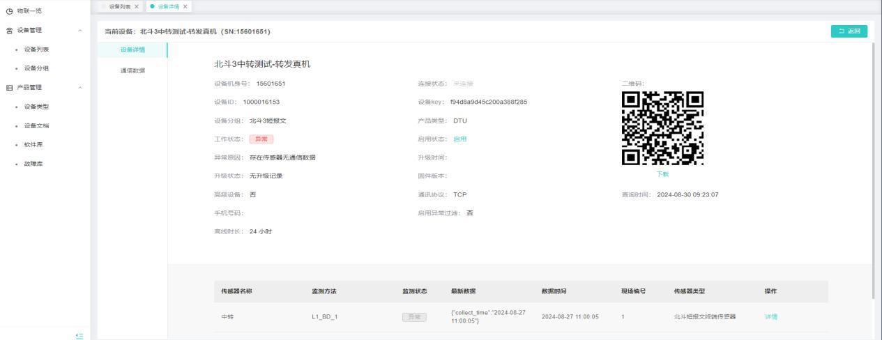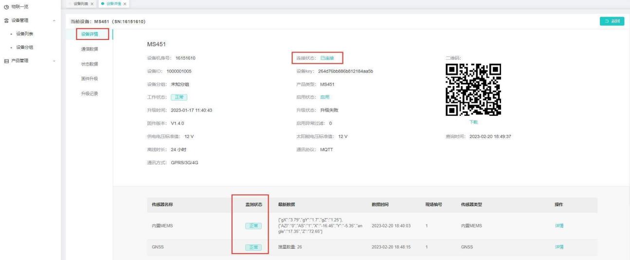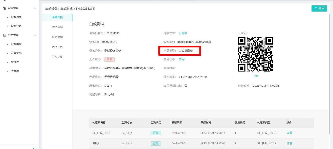 4、详情页面有5个Tab页,分别为【设备详情、通信数据、状态数据、固件升级、升级记录】