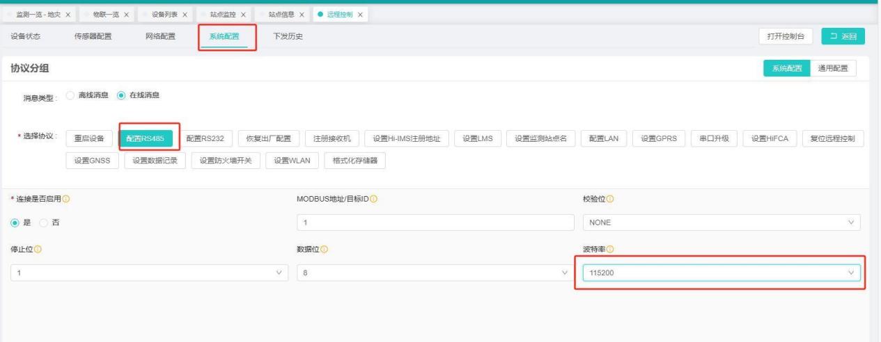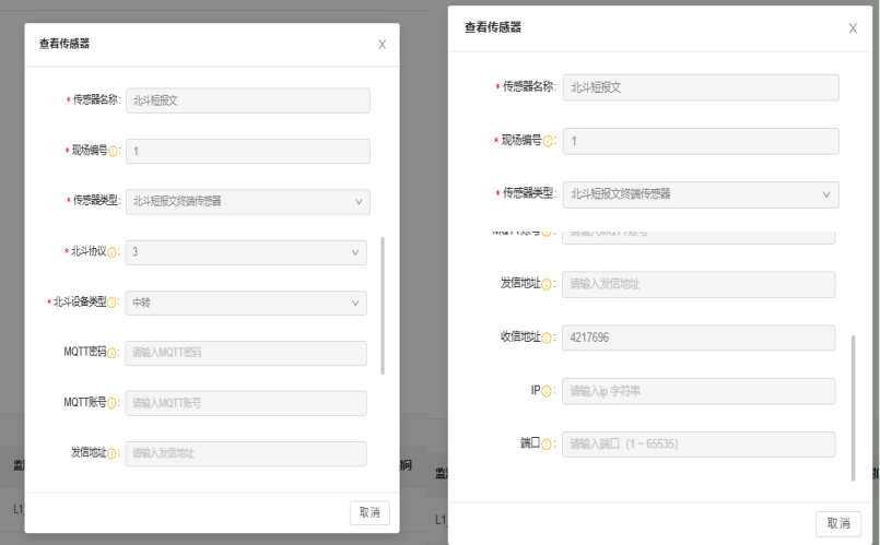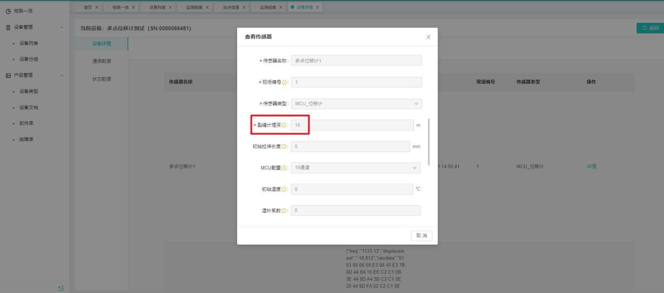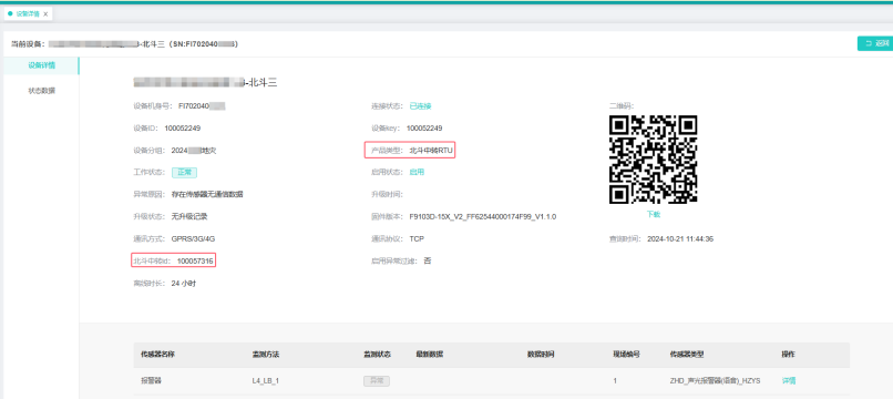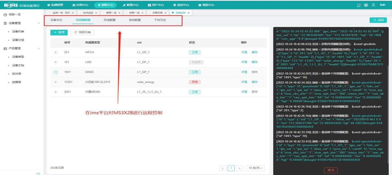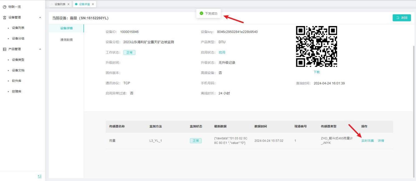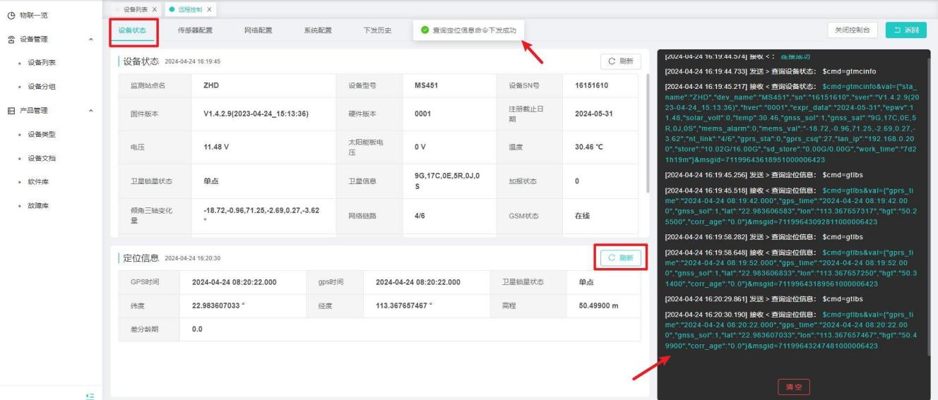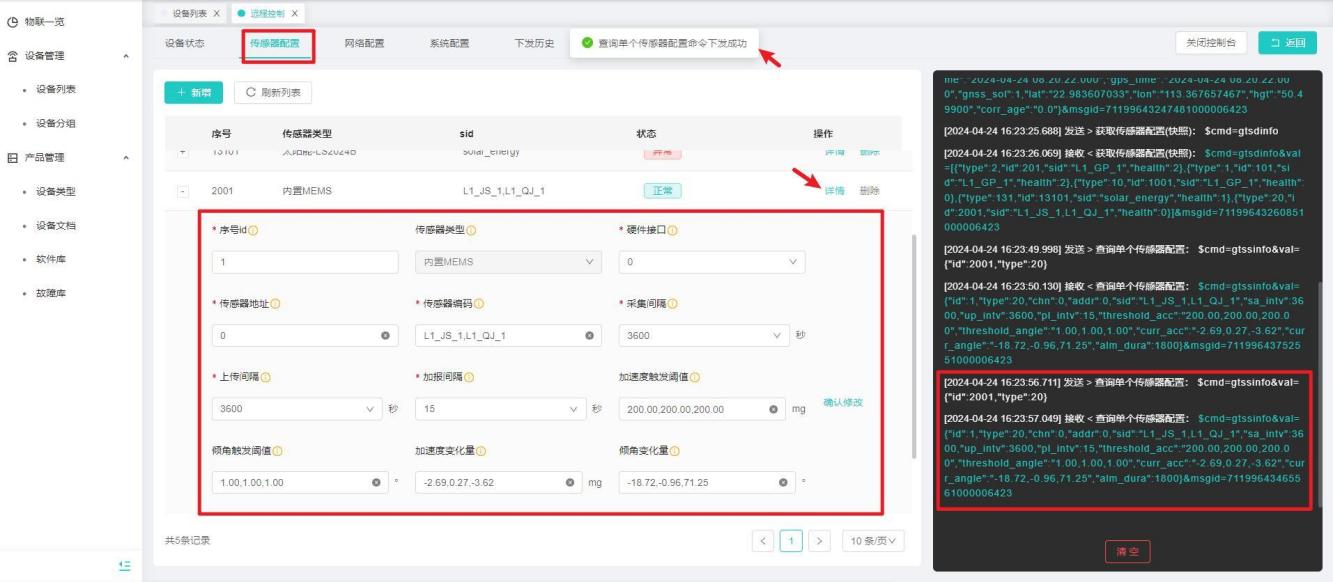 点击【打开控制台】,点击【详情】,右侧按照设定的远程控制协议下发送【查询单个传感器配置】协议;左侧界面,根据右侧【远程控制】框内回执情况进行刷新展示