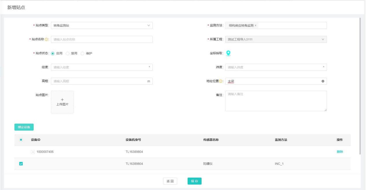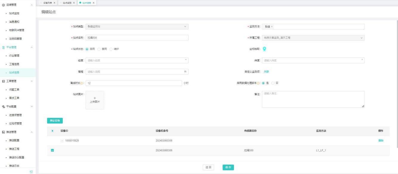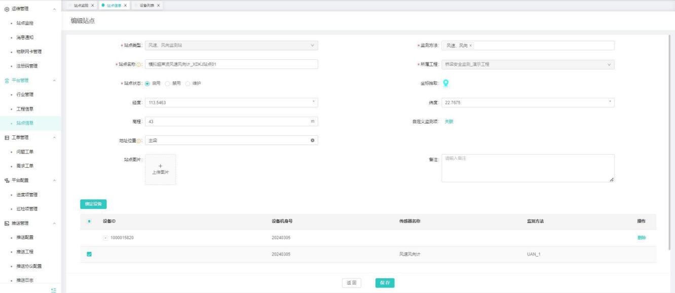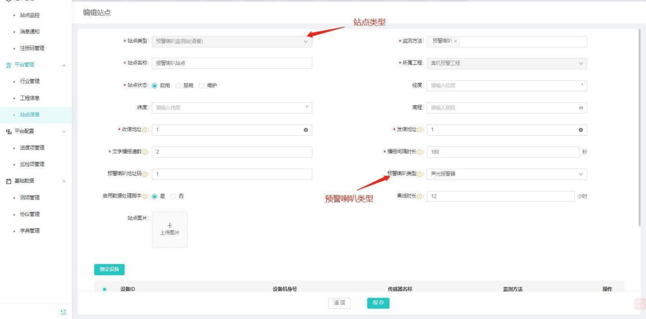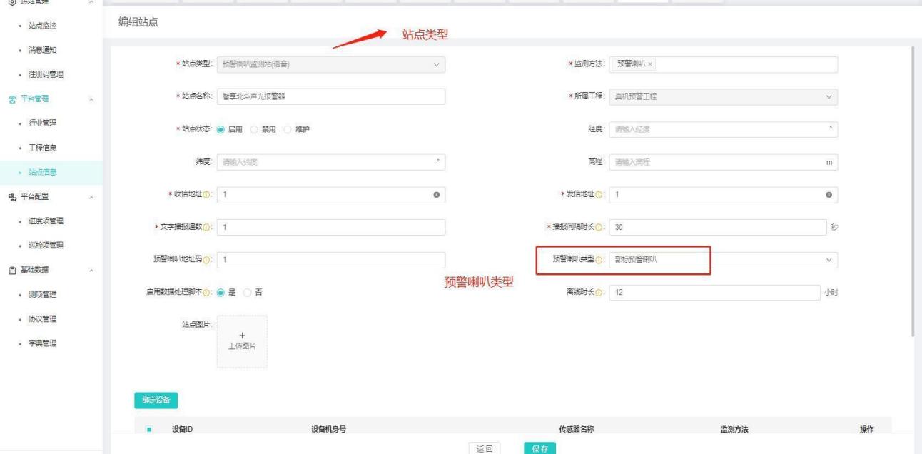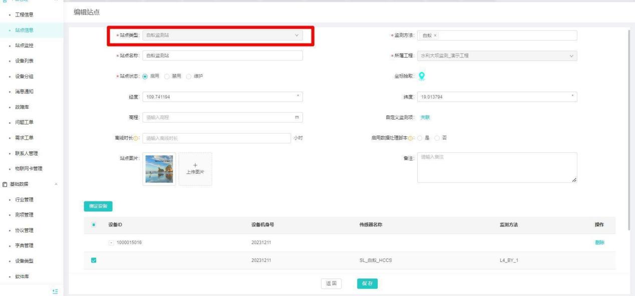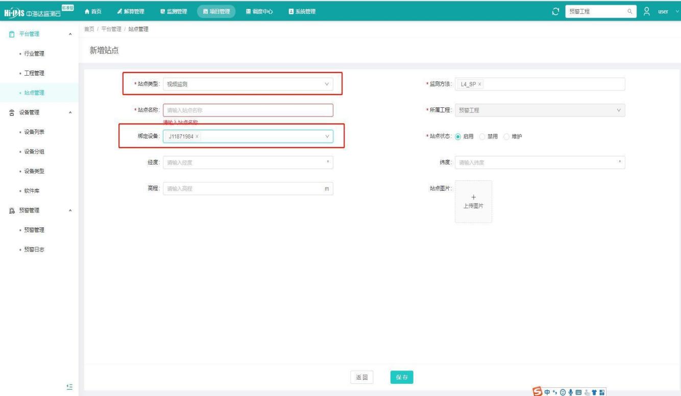 2、进入”项目管理”-“平台管理”-”站点管理”,新增站点,站点类型选择”视频监测”,绑定视频设备