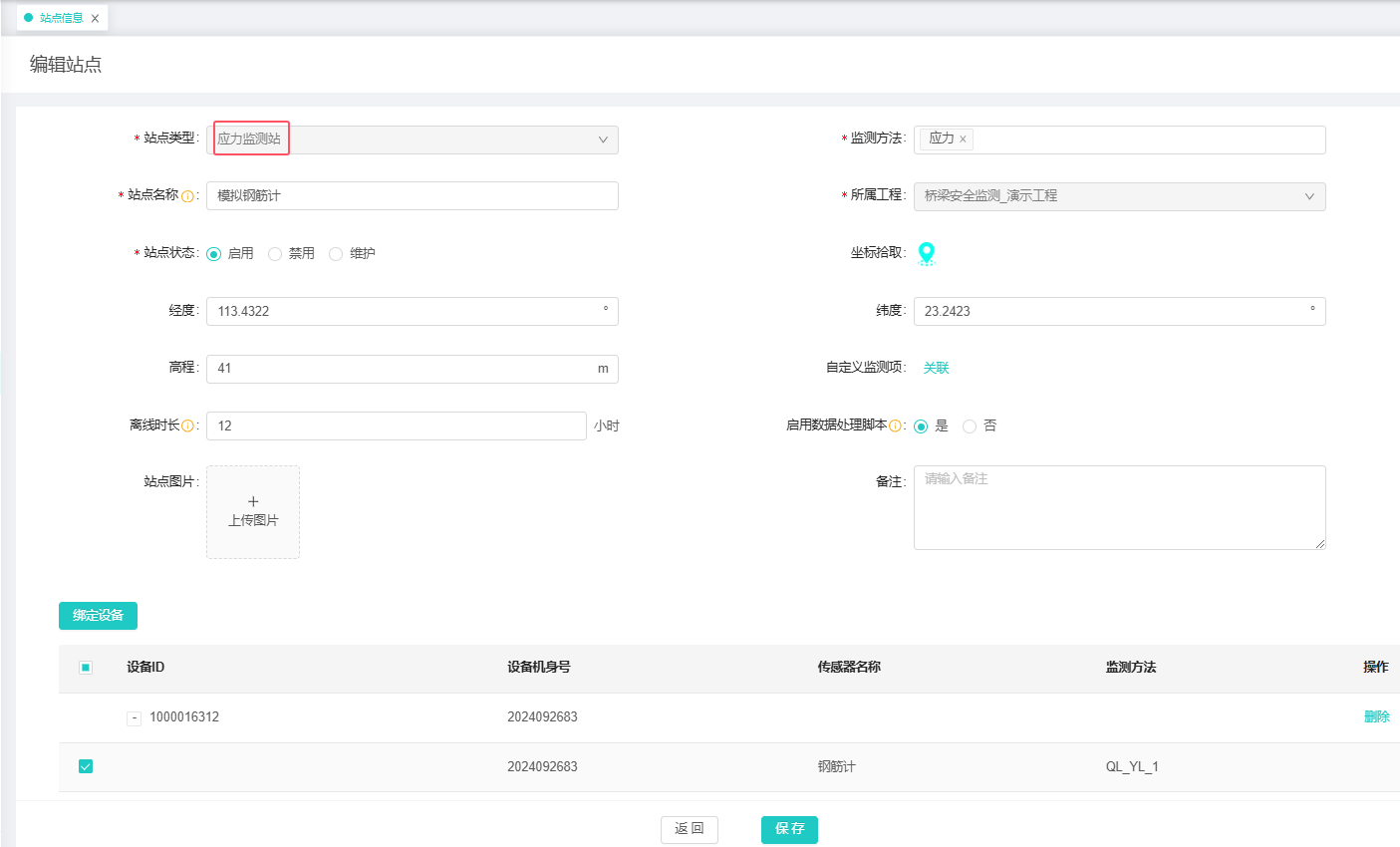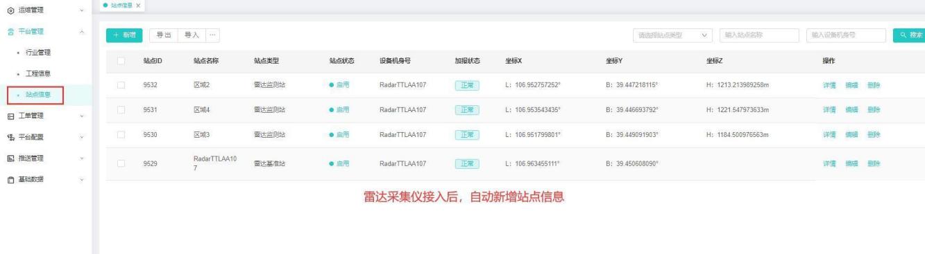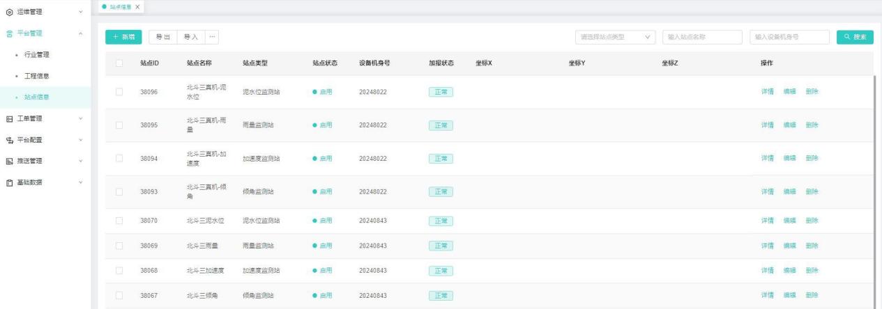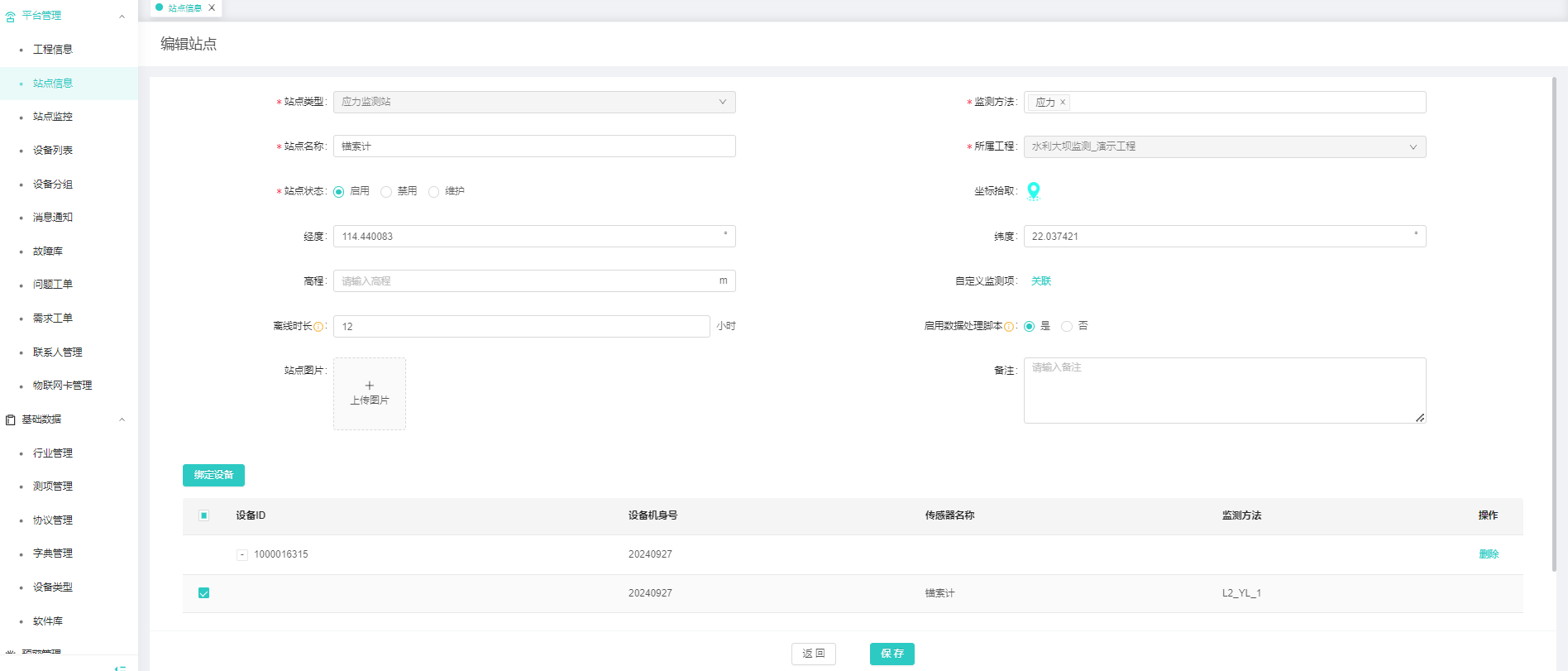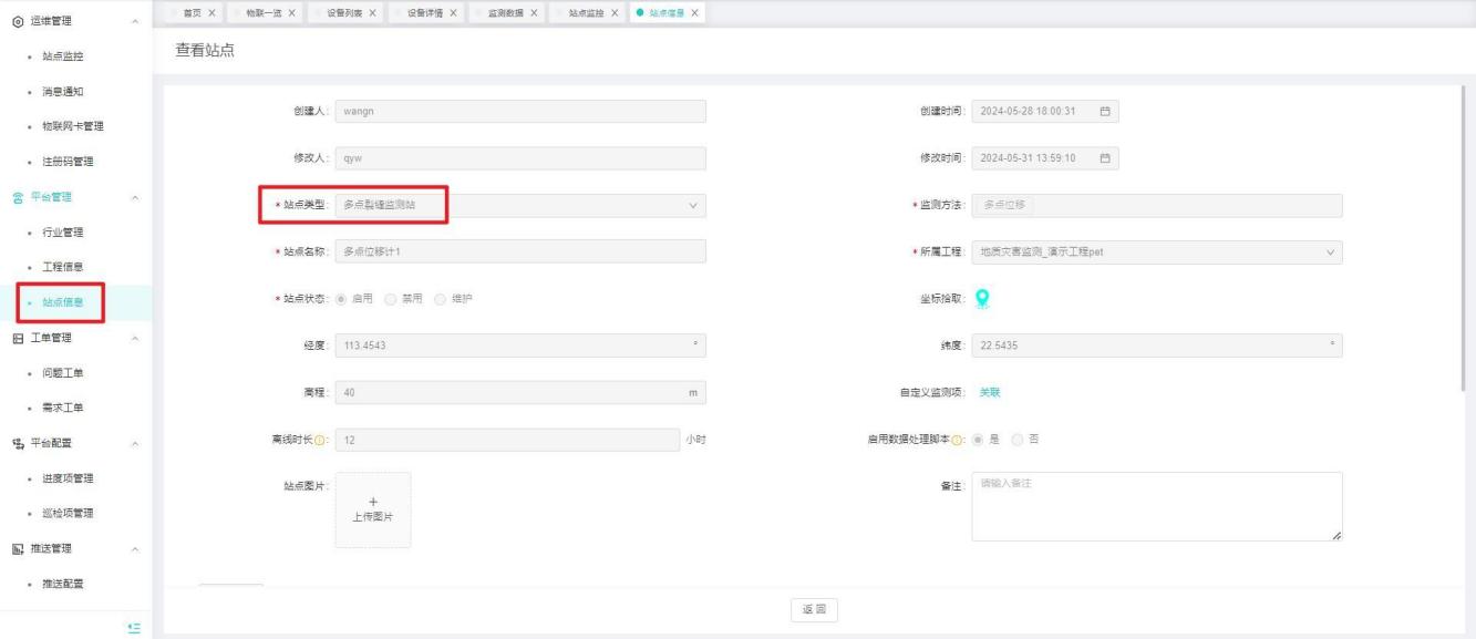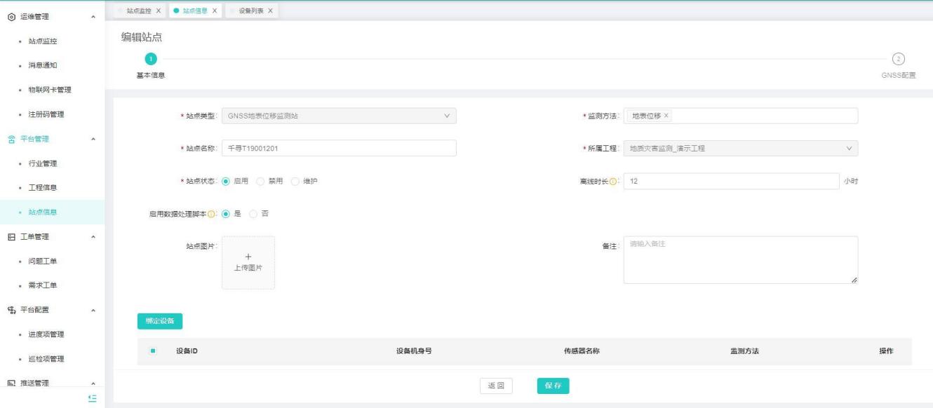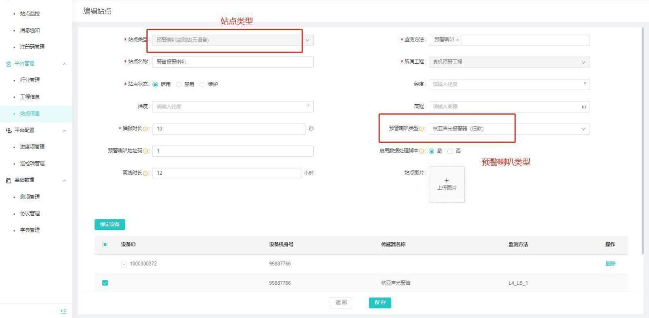 2、进入”项目管理”-“平台管理”-”站点管理”,新增站点,站点类型选择”视频监测”,绑定视频设备