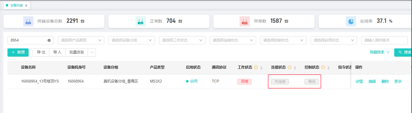 3、设备离线后,已超过离线时长,连接状态显示【未连接】,控制状态显示【离线】