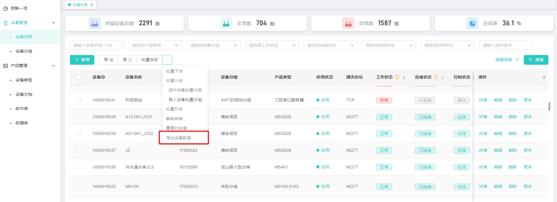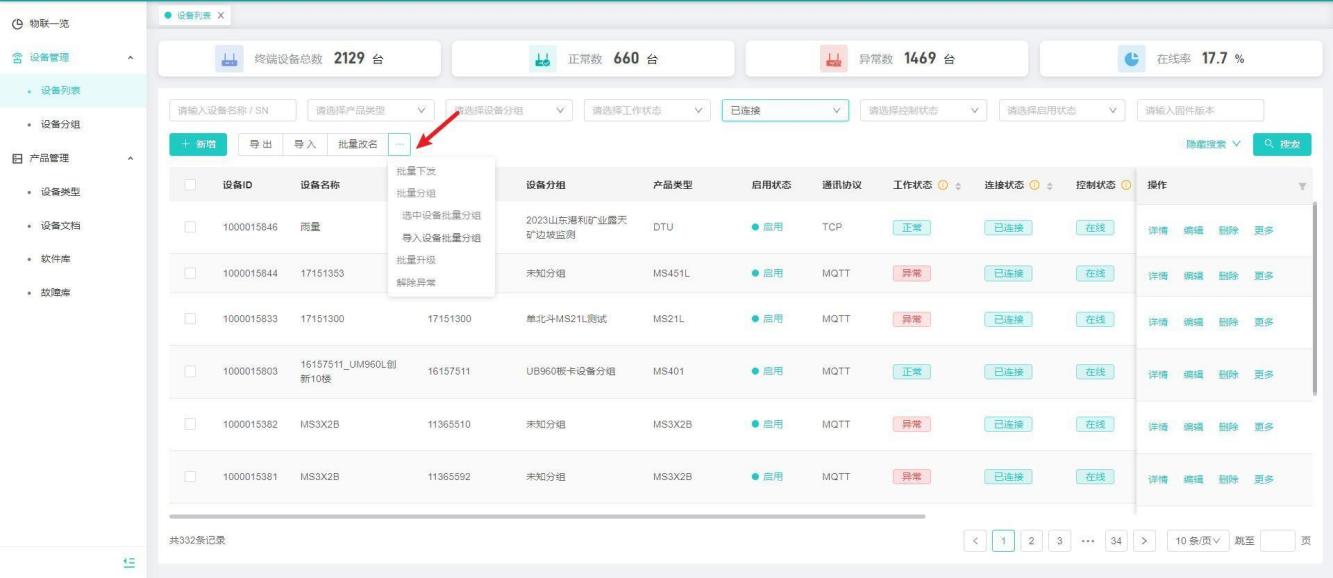 1、进入【物联中心】-设备管理-设备列表,选择同一产品类型设备,点击左上角【更多】