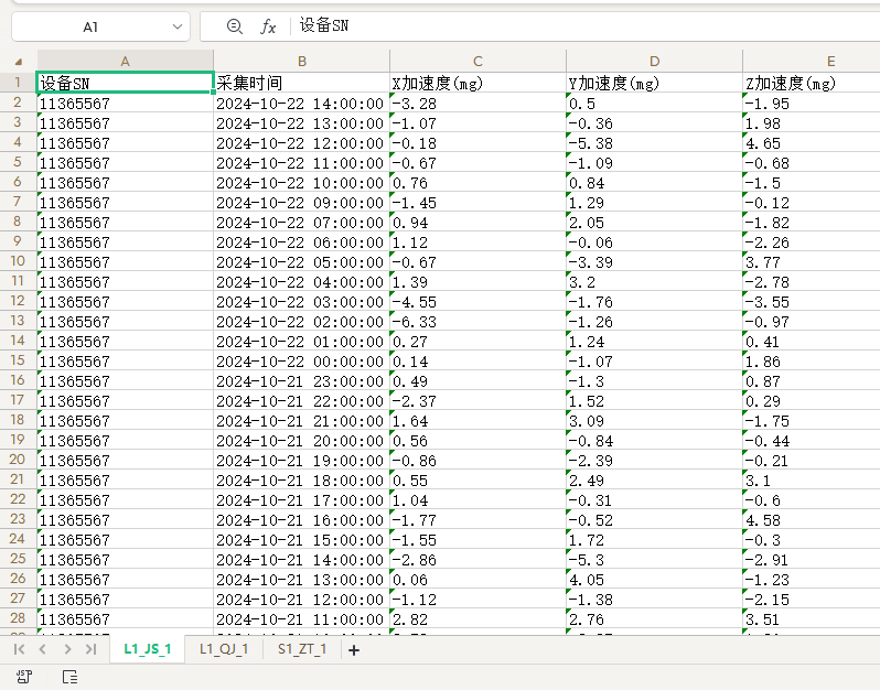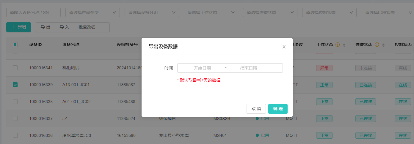 在设备列表中,勾选需要导出的设备,选择导出设备数据的时间,不选择时间则默认导出近七天的数据。确定,选择设备的通信数据、状态数据导出到Excel表格中。
