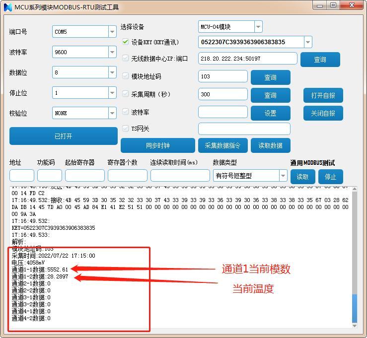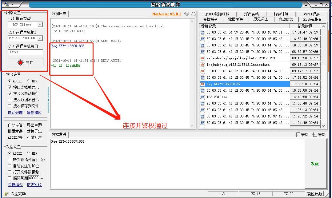 KEY=设备SN,使用网络调试助手模拟TCP协议接入,发送鉴权信息Reg Key=xxx(xxx为设备SN)