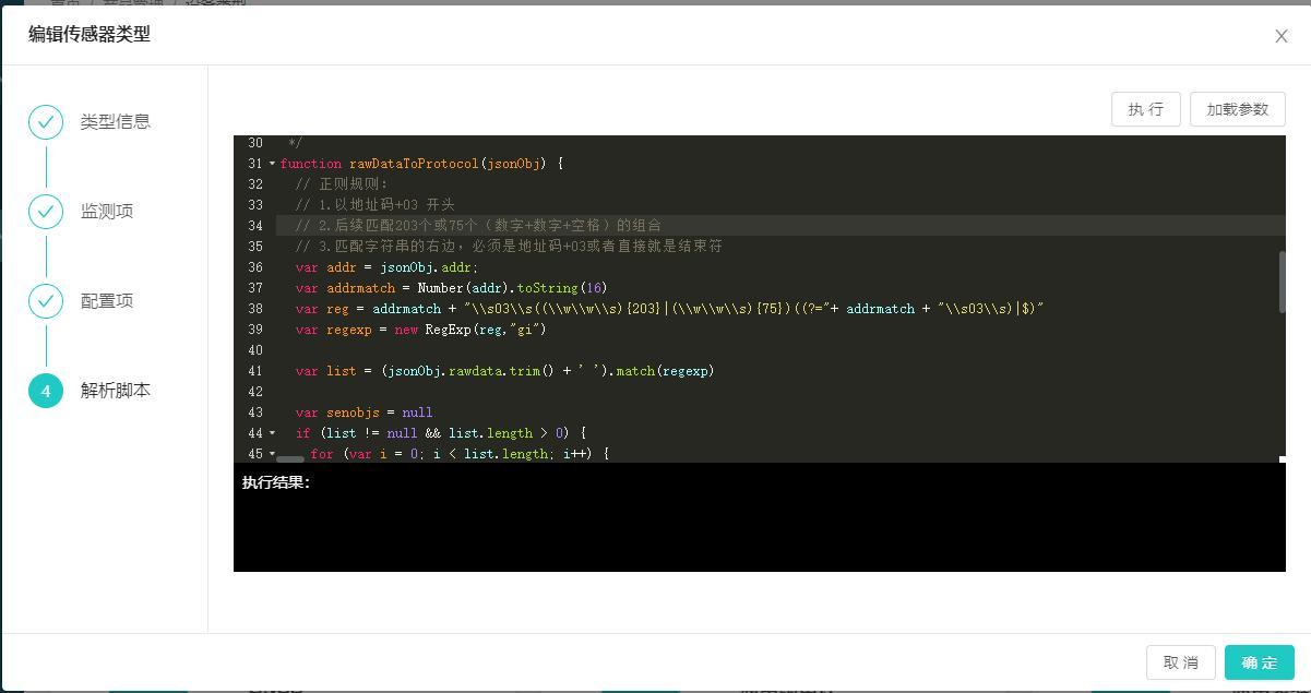点击物联中心“产品管理”-“设备类型”-“传感器类型”,点击终端类型VWM-50,在弹窗窗体中选择解析脚本,进行自定义解析脚本的编写