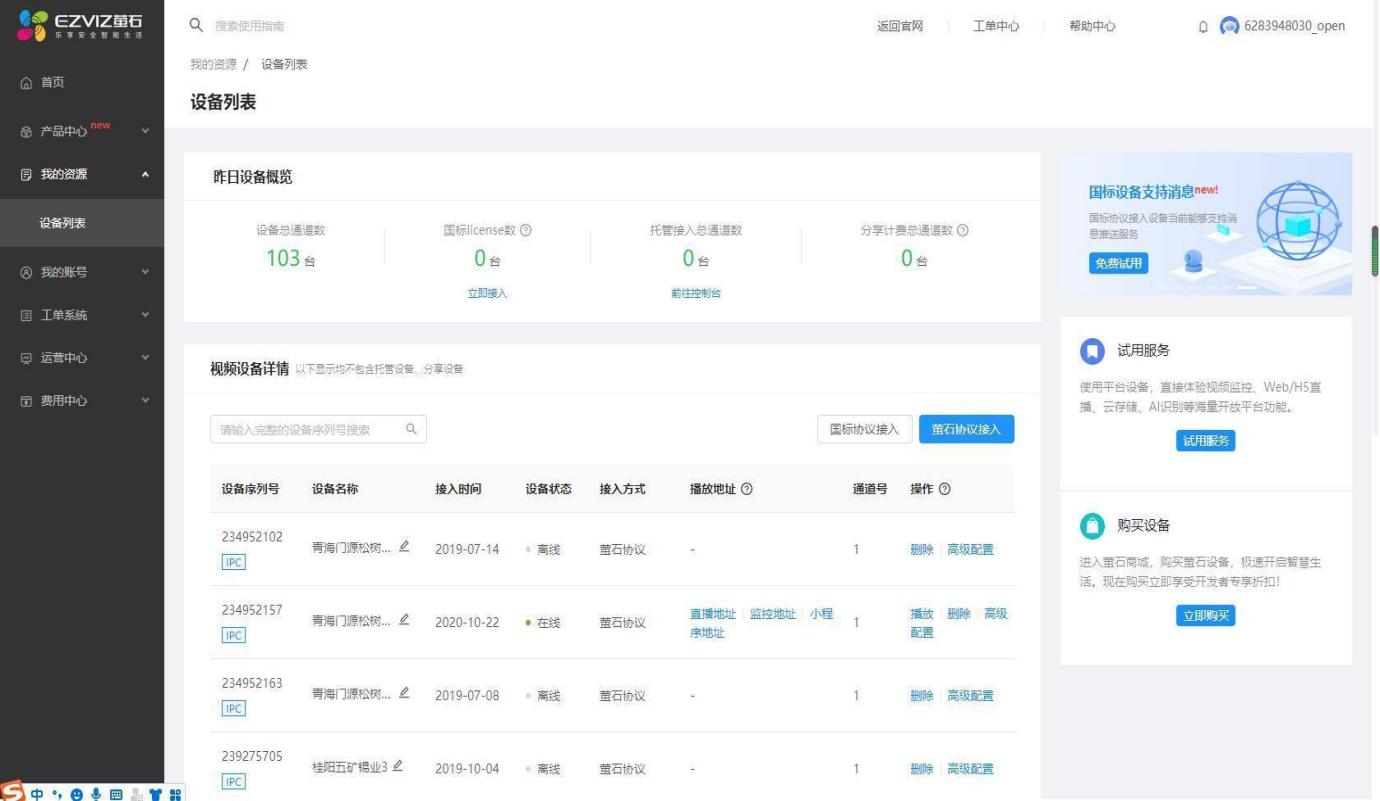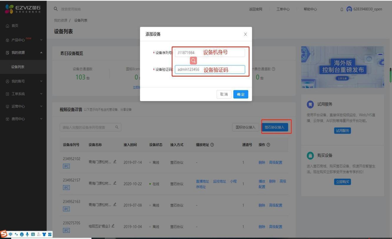 3、登录萤石云设备平台https://open.ys7.com/console/device.html通过用户名:18613098128 密码:(zhdgps)668登录