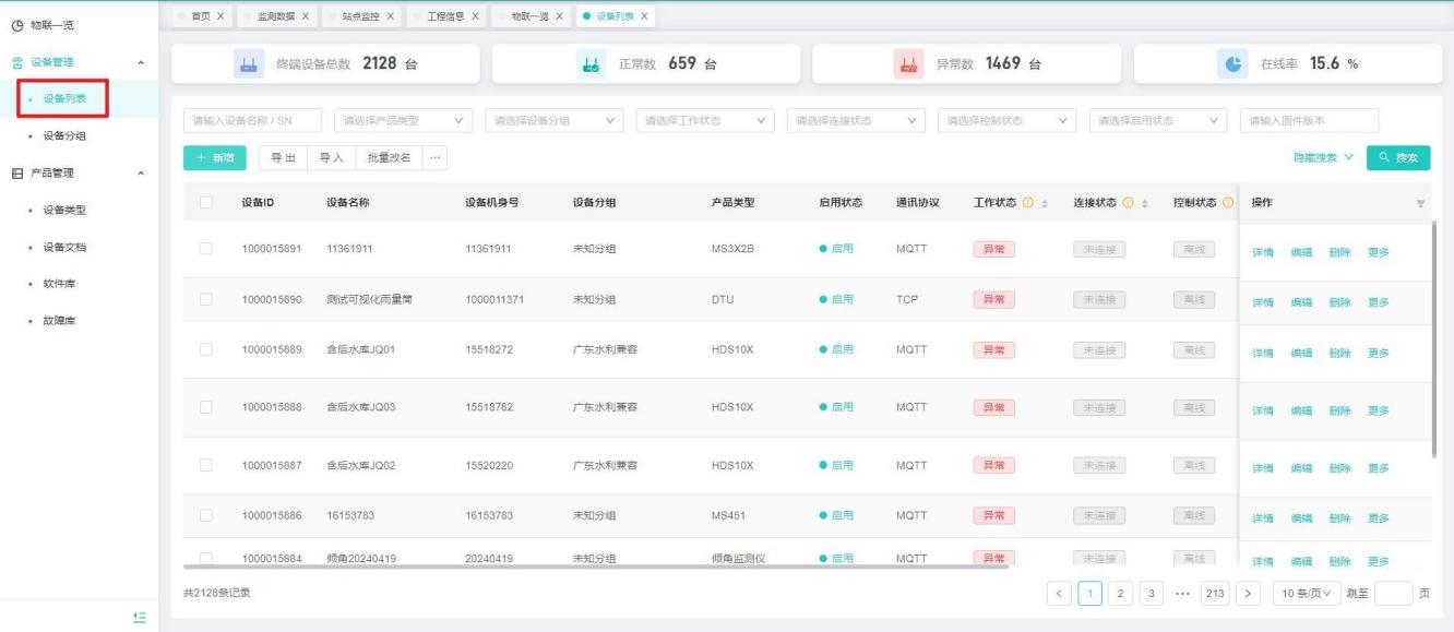 【操作说明】用户登录系统后,点击【物联中心】进入设备管理-设备列表,可根据搜索条件查询设备。