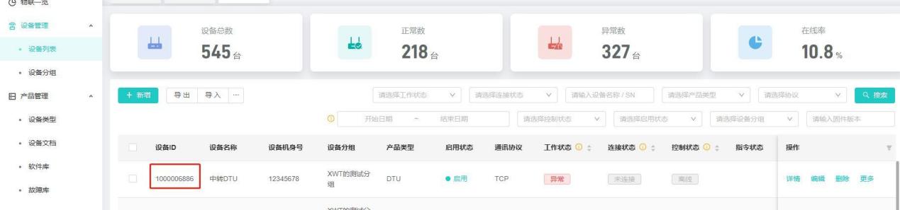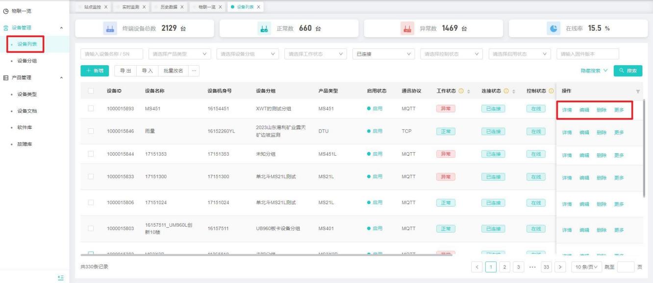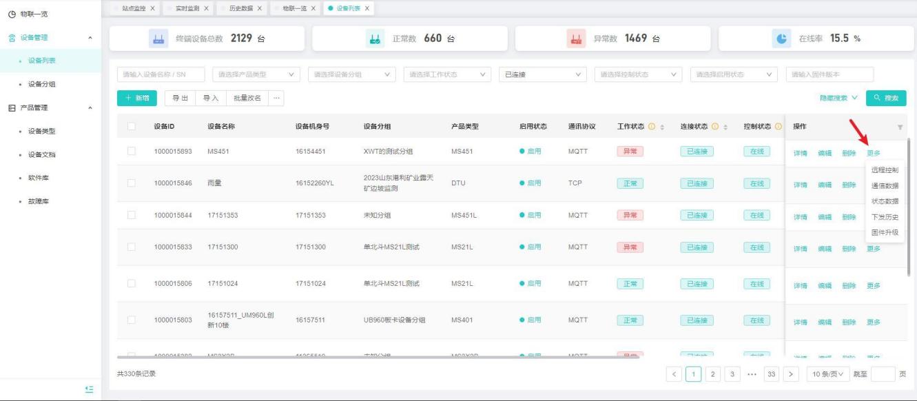 【设备列表】详情一列,可支持查看、编辑、删除和更多【包含:远程控制、通信数据、状态数据、下发历史、固件升级】