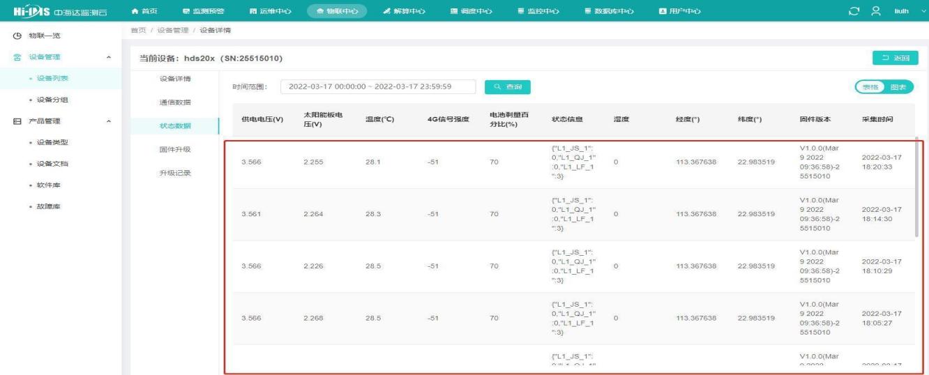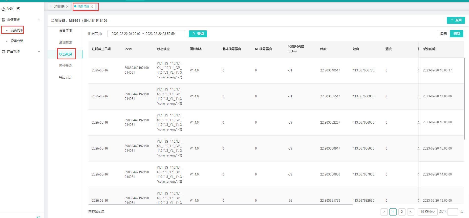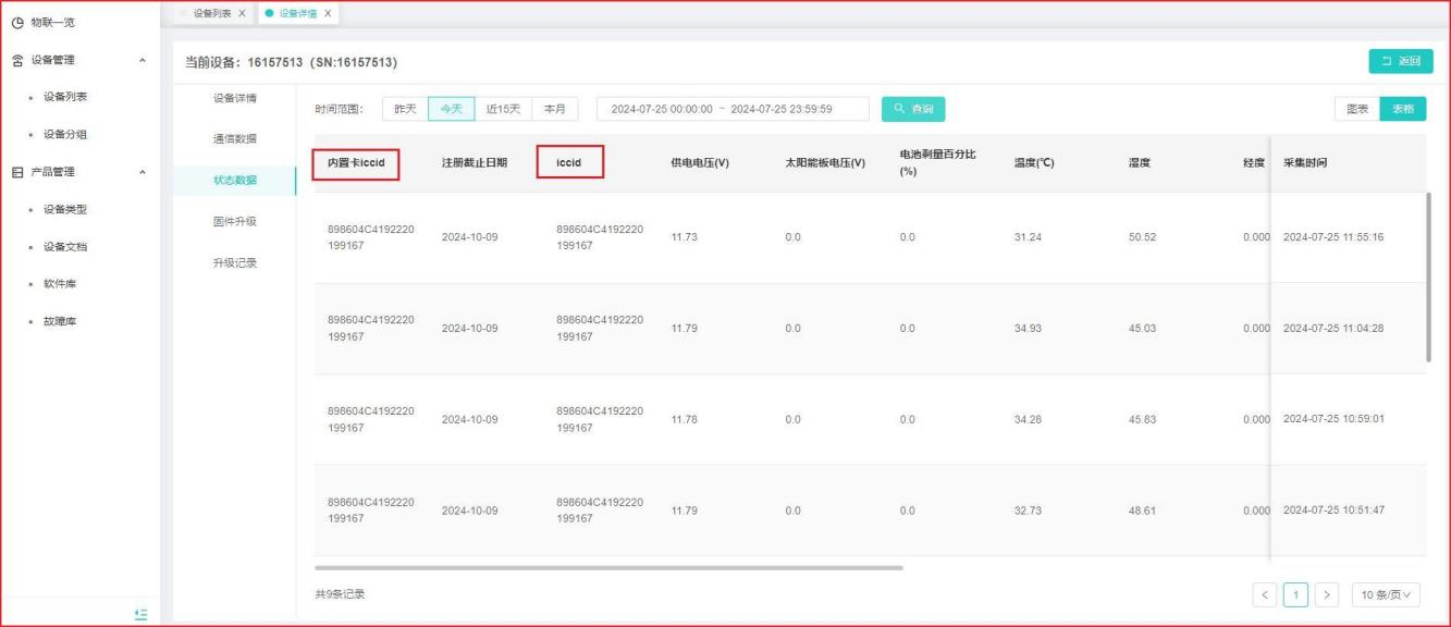 设备已存在内置卡的MS4XX、MS3X2B系列产品,进入物联中心-设备列表-设备详情-状态数据中,查看上报的“内置卡iccid”和“iccid”状态数据。