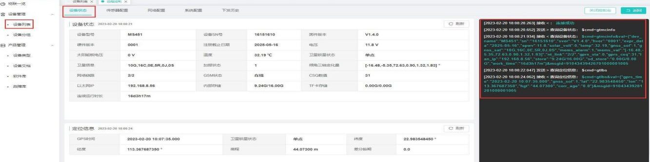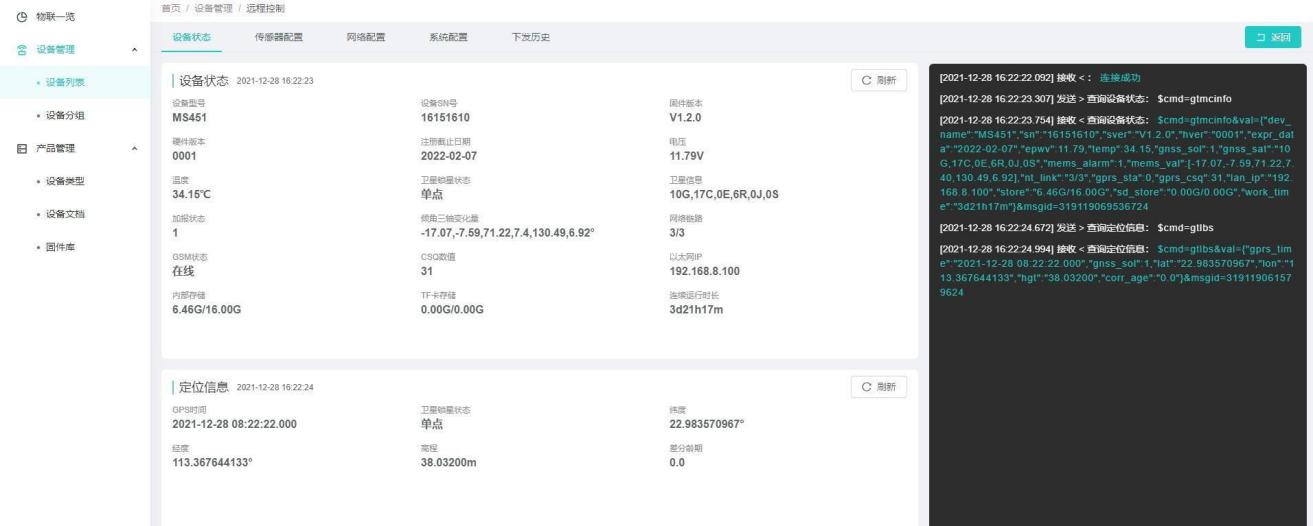 自动下发协议:进入【物联中心】-设备管理-设备列表,点击设备后的【更多】-远程控制-“设备状态”Tab页,点击【打开控制台】,右侧远程控制框,按照设定的远程控制协议【查询设备状态->查询定位信息】下发顺序,自动发送第一条协议,在配置时间内(如10s)收到回执后继续下发下一条远程控制协议;左侧根据右侧回执情况进行刷新展示