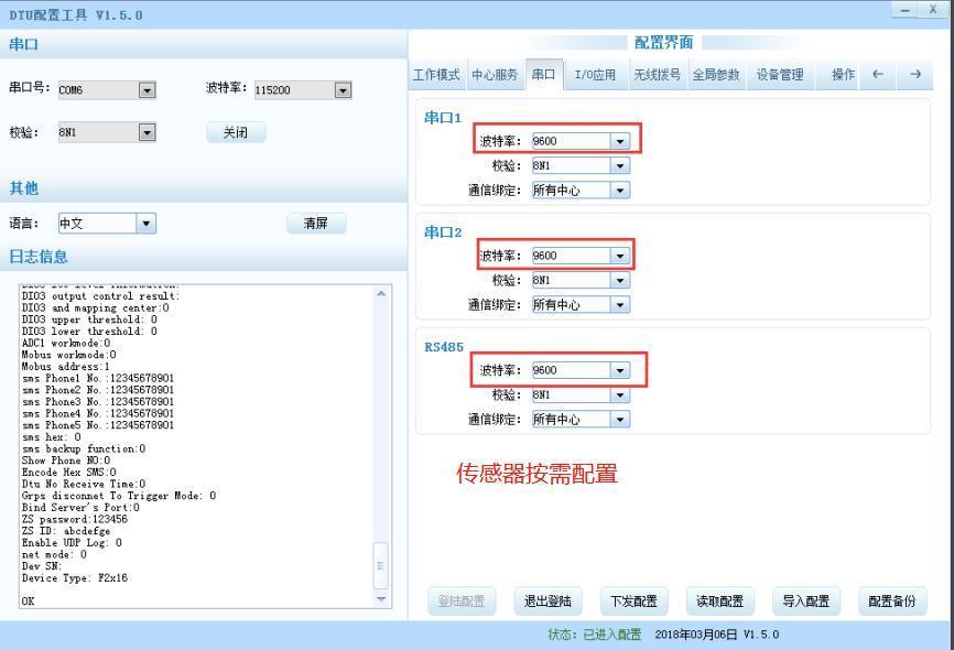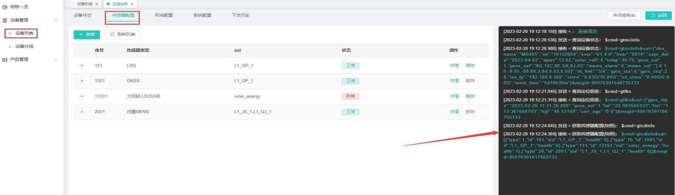 自动发送协议:切换到【传感器配置】Tab页面,右侧按照设定的远程控制协议,自动下发【获取传感器配置(快照)】协议。