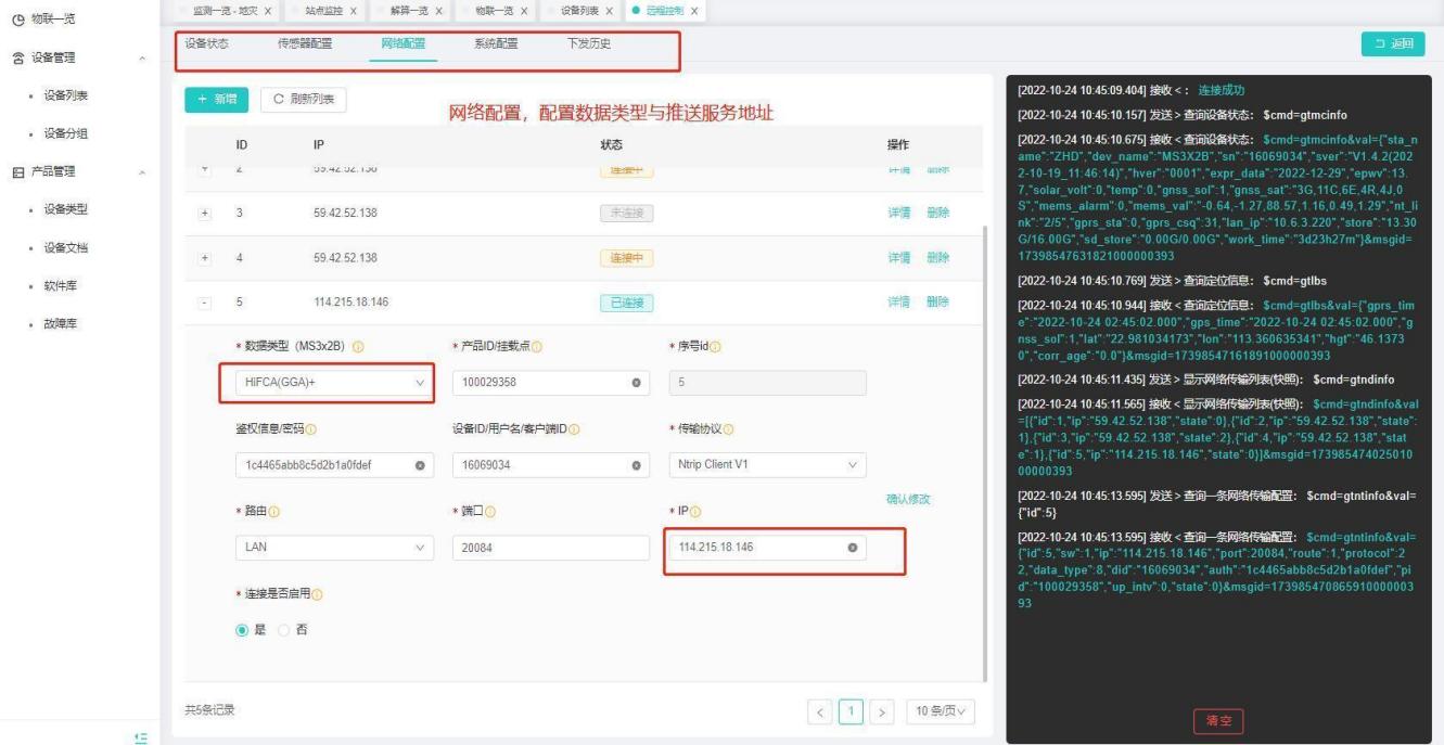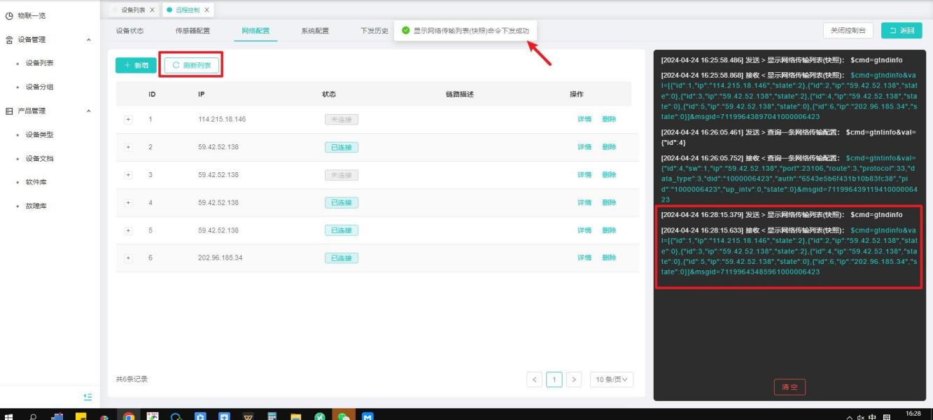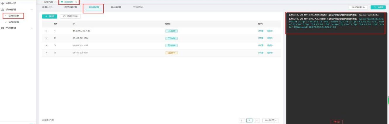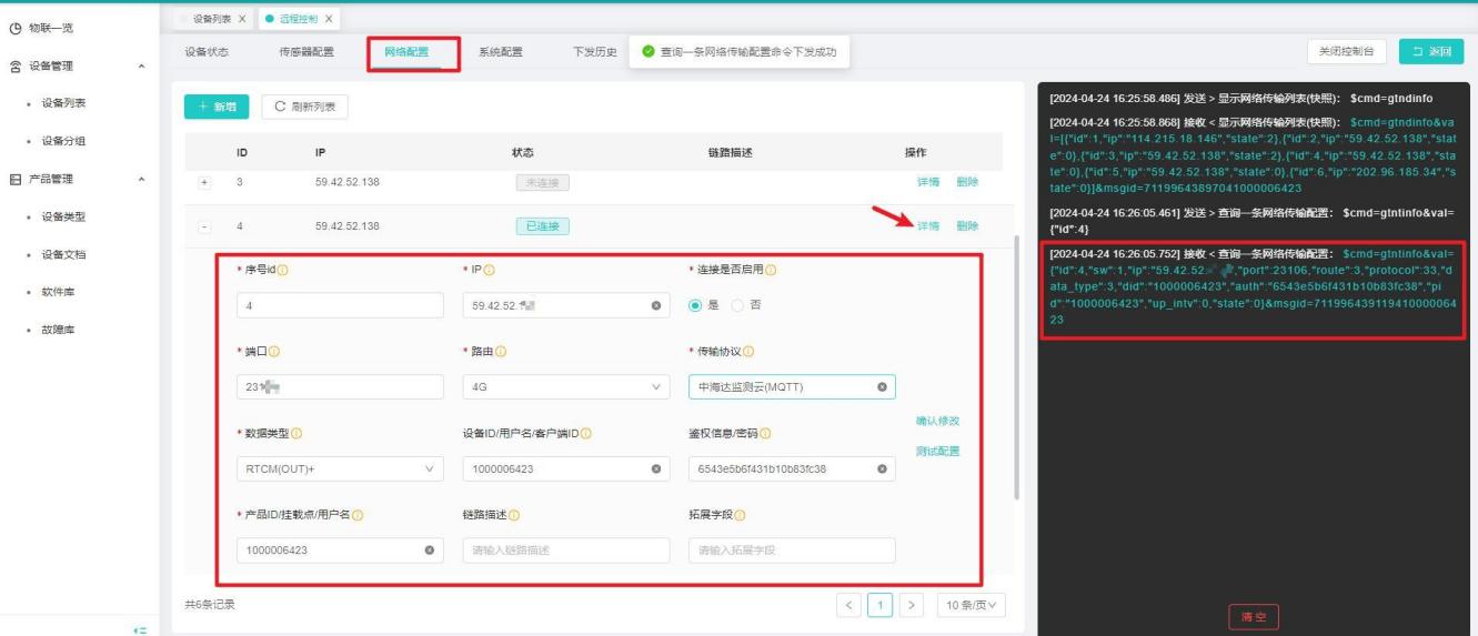 点击网络链路后的【详情】,右侧按照设定的远程控制协议下发送【查询一条网络传输配置】协议;左侧界面根据右侧【远程控制】框内回执情况进行刷新展示
