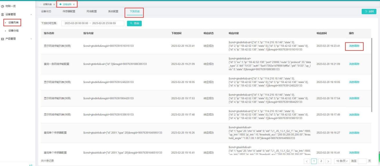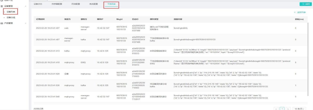 1. 切换到【下发历史】Tab页,自动显示当天所有协议下发的远程控制消息记录