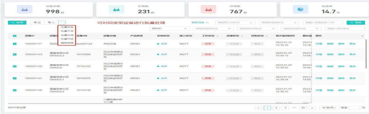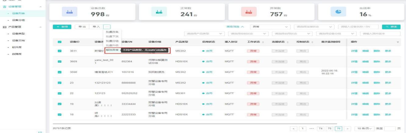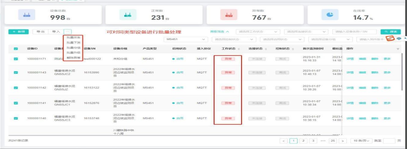 针对同类型设备,添加了批量处理功能。优先勾选同类型设备后,可对其进行批量修改名称、批量下发远程协议、批量进行分组、批量固件升级及批量解除设备异常状态等。
