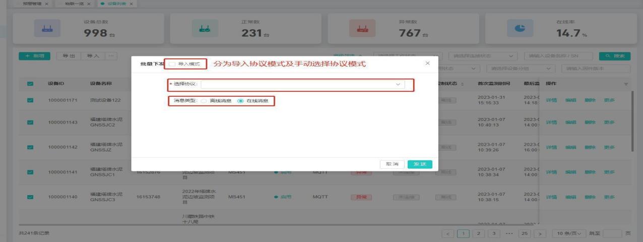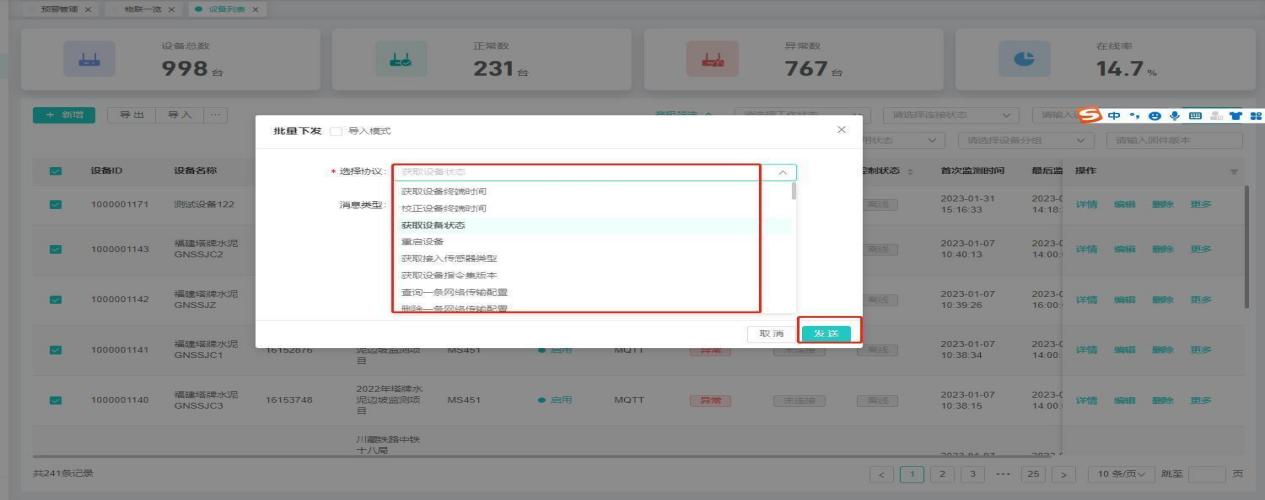 1. 勾选设备列表同类型设备后,点击列表左上角【更多】-选择【批量下发】