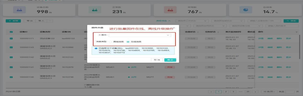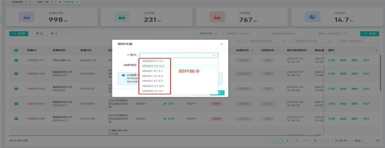 1、勾选设备列表同类型设备后,点击列表左上角【更多】-选择【批量升级】,选择固件包,消息类型,点击【发送】