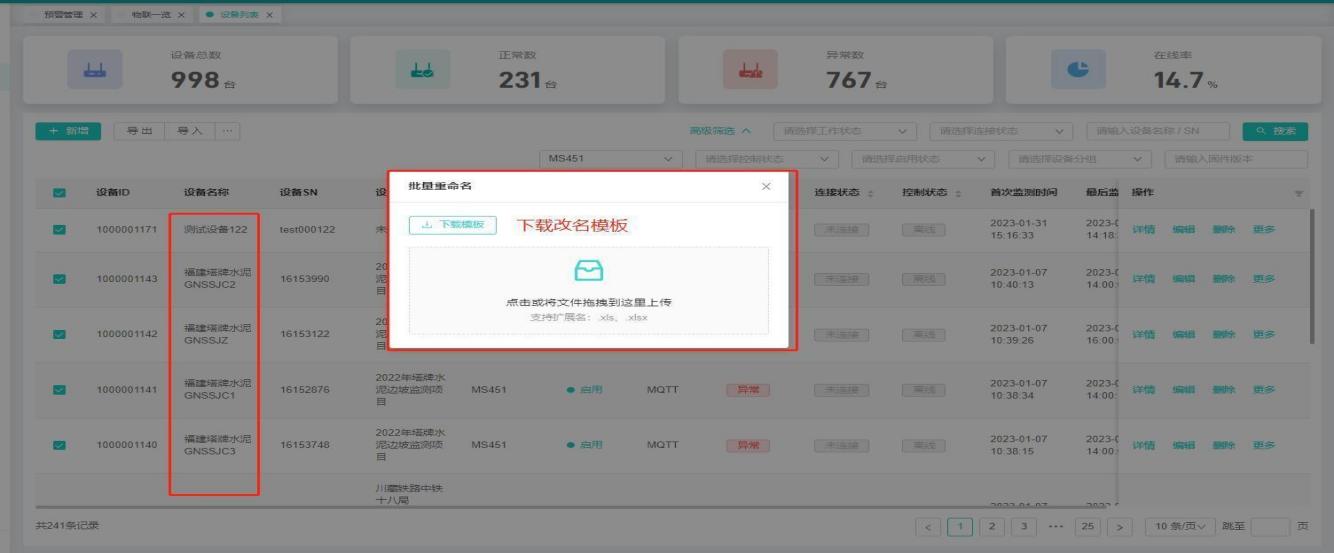1、勾选设备,点击设备列表左上角”更多”-选择【批量改名】,点击【下载模板】并编辑文档,输入对应sn及设备名称后再【导入】,即可更新文档中最新设备名称