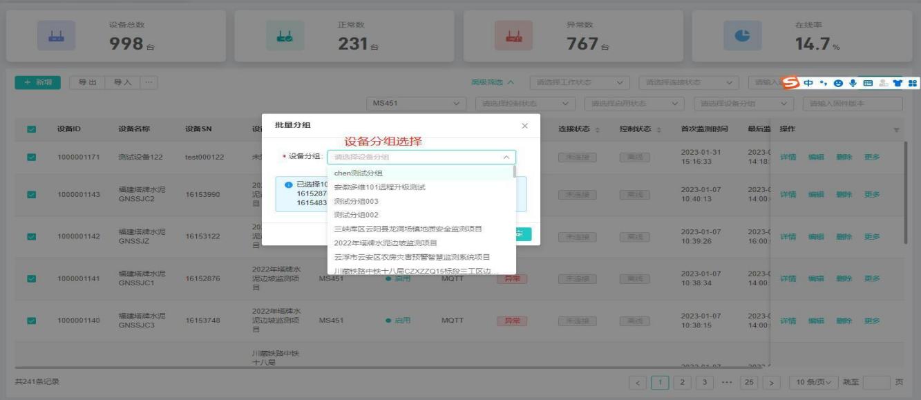 勾选设备列表设备后,点击设备列表左上角”更多”进入批量分组弹框页;选择分组后,当前勾选设备均更新设备分组