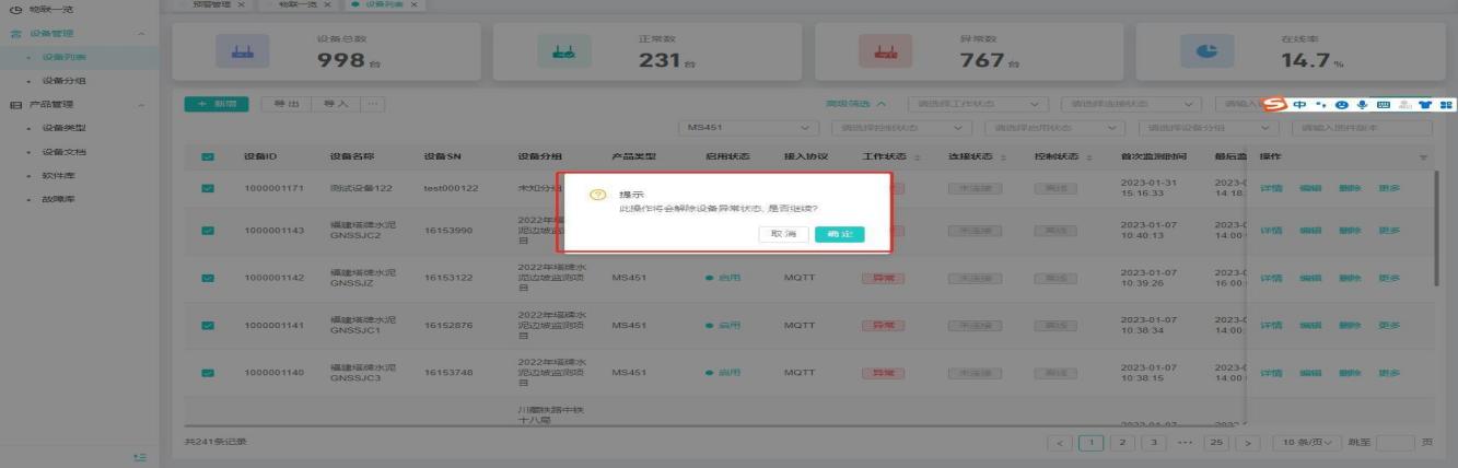 2、点击【解除异常】弹框提示继续解除操作后,勾选的设备异常状态,均被取消恢复正常状态,如下图所示: