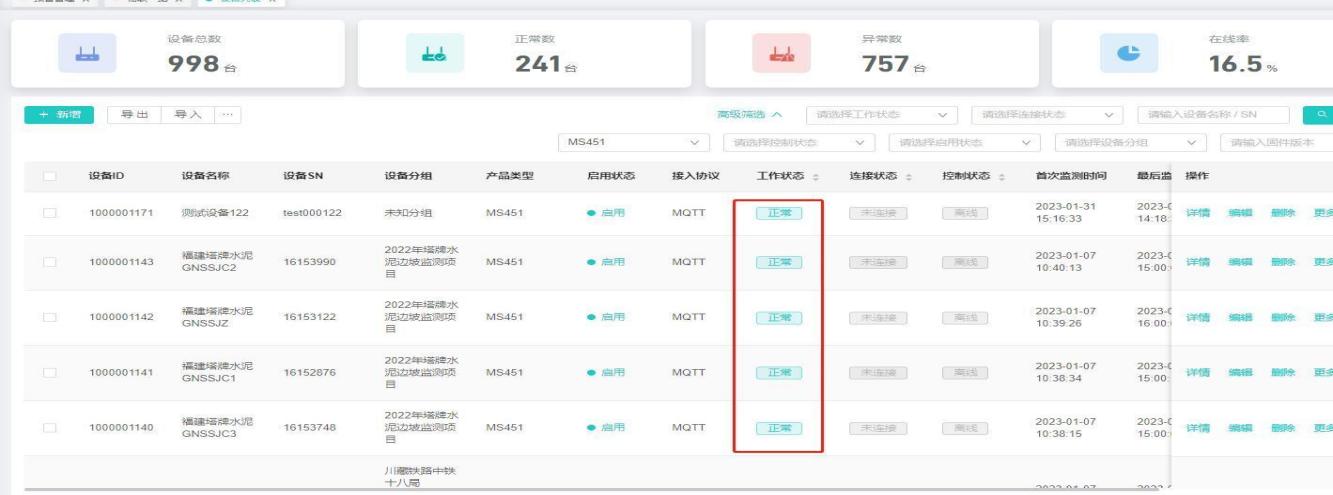 5、设备列表,设备存在GNSS观测数据,LMS+,状态数据,高动态数据为判断离线标准,只要满足其中一项在线就表示在线;