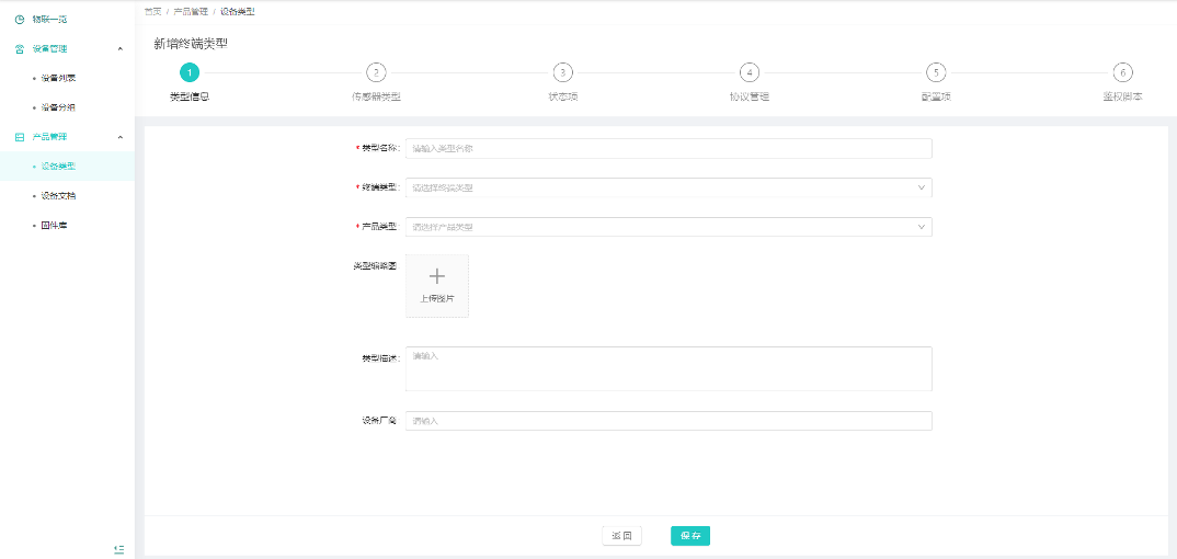 新增设备类型时分为6个Tab页面:类型信息、传感器类型、状态项、协议管理、配置项、鉴权脚本
