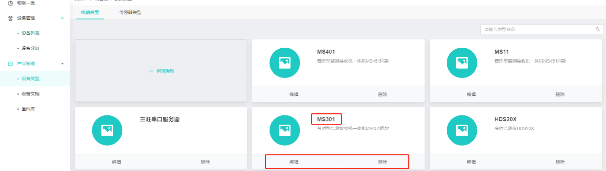 【功能说明】对设备类型、传感器类型、设备文档及固件库进行【增】【删】【改】【查】管理。