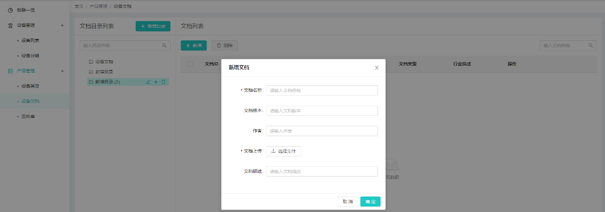 选择文档目录,点击文档列表界面的“+新增”按钮,显示新增文档弹窗,输入文档信息,点击“确定”按钮