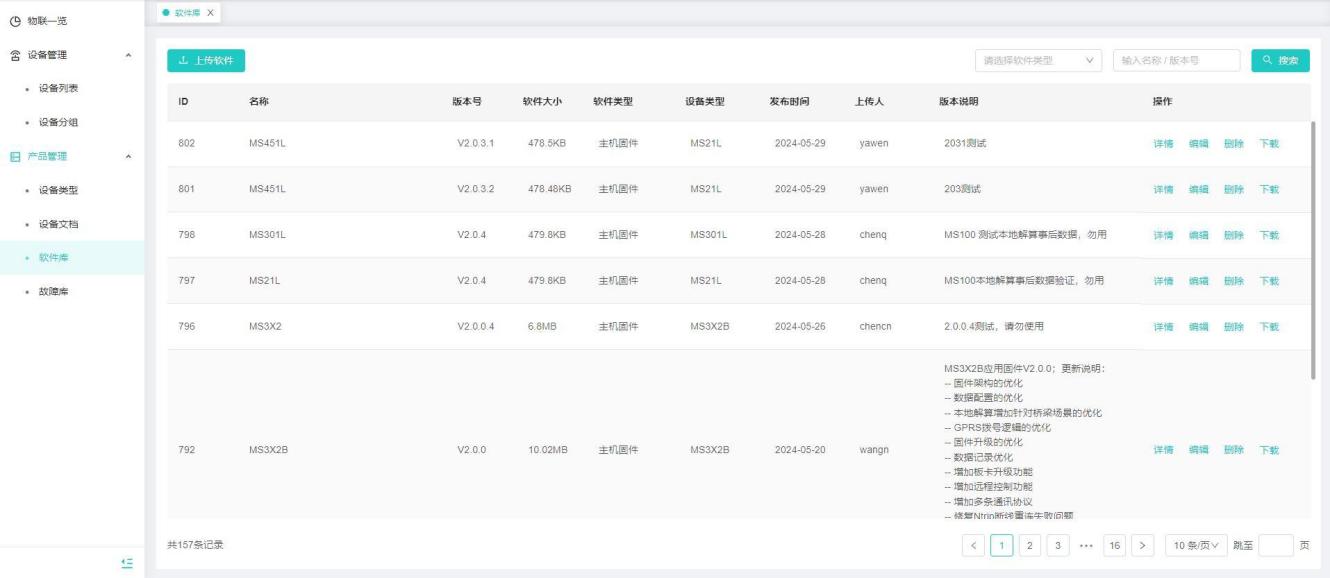 软件库列表界面可进行固件详情查看、编辑、删除和下载操作