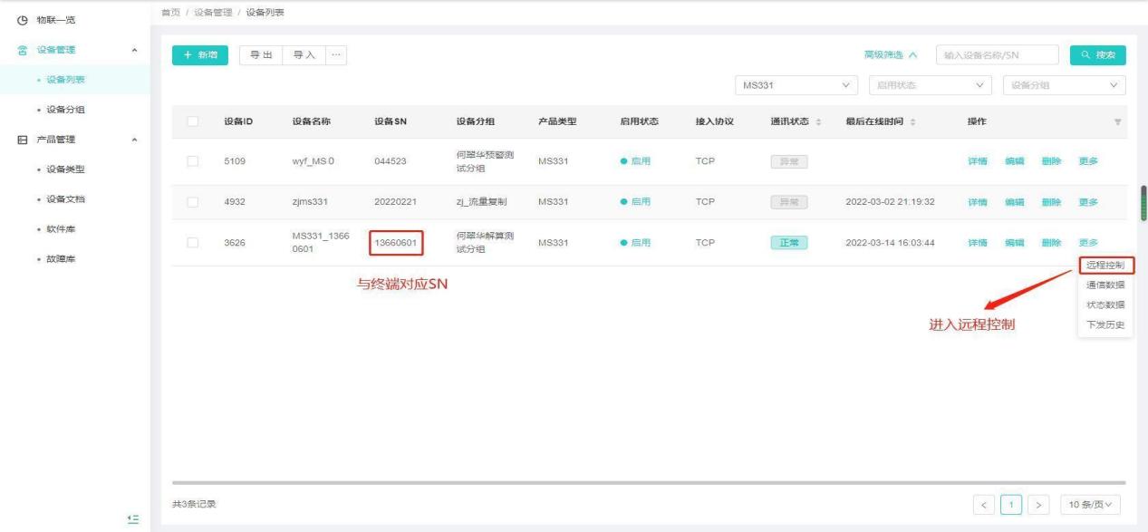 2、产品类型选择DTU,【更多】下的【远程控制】进入远程控制界面