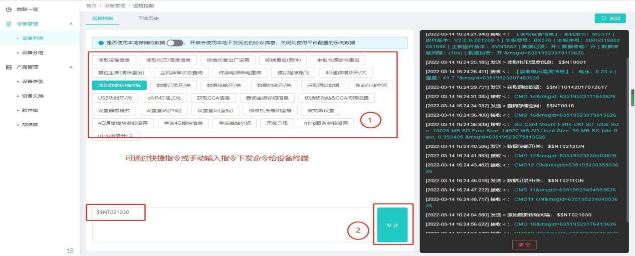 “更多”菜单下包含远程控制、通信数据、状态数据、下发历史、固件升级、升级记录,远程控制界面用于与终端设备进行交互