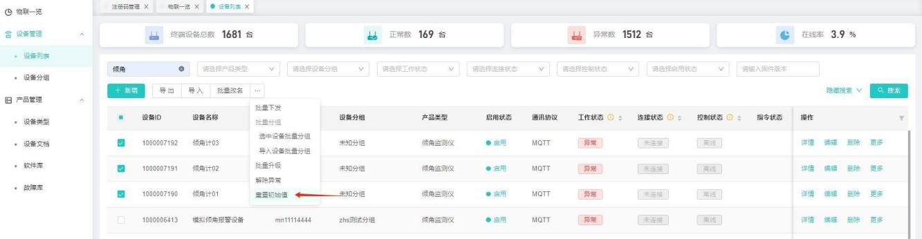 勾选多个相同类型的设备,选择批量重置初始值,下发重置初始值任务,设备会将最新上报的数据作为初始值。