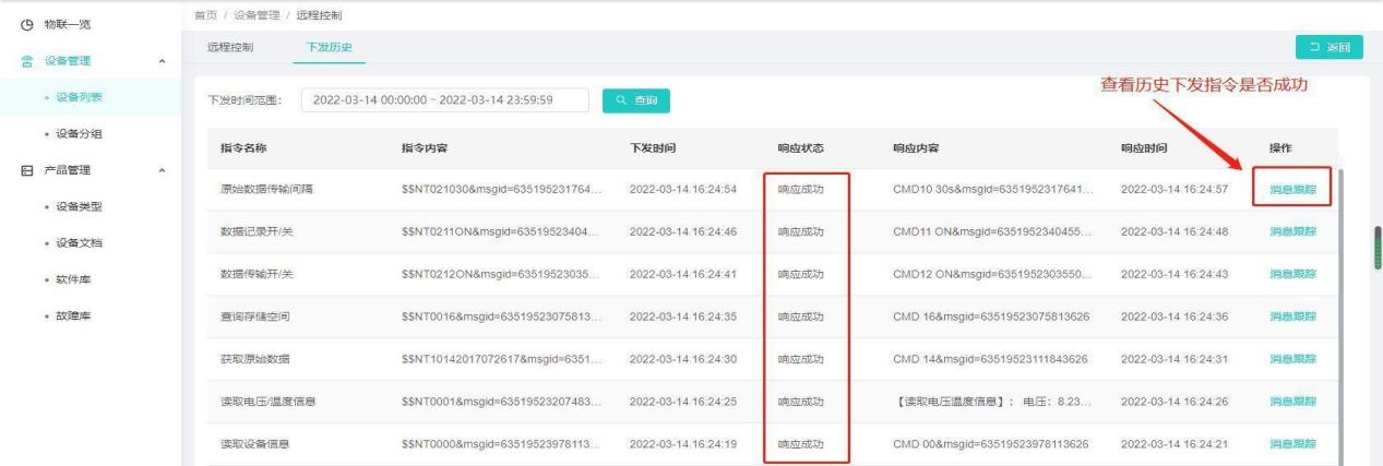 1. 点击【下发历史】记录中的某一个消息记录后的【消息跟踪】,可以查看该协议的远程控制消息跟踪记录