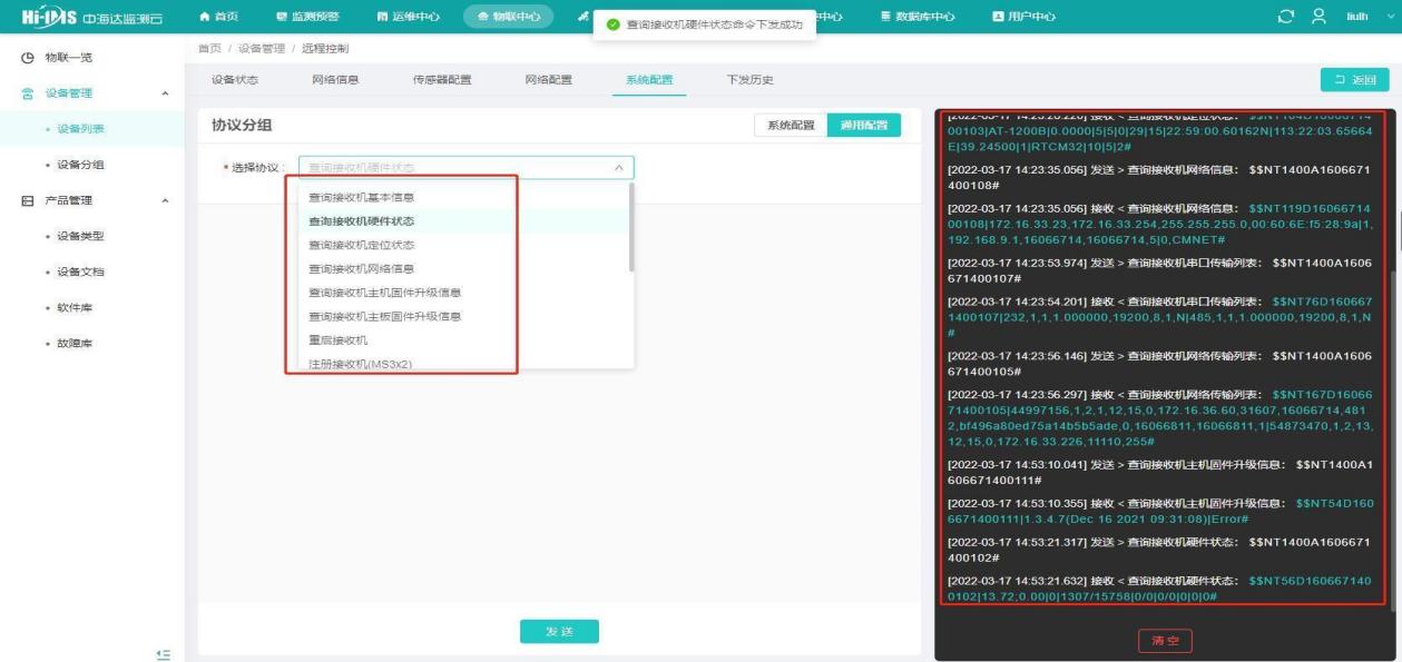 1、点击已配置前置协议的协议按钮,右侧框按照设定的远程控制协议,下发送一条前置协议(如:查询GNSS配置);右侧【远程控制】框内,根据设备回执情况进行展示