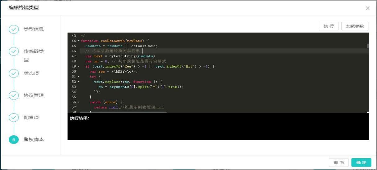 点击物联中心“产品管理”-“设备类型”-“终端类型”,点击终端类型MCU,在弹窗窗体中选择鉴权脚本,进行自定义鉴权脚本的编写
