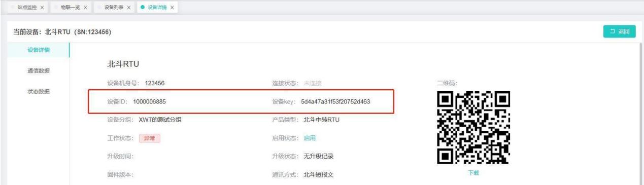 注:设备详情页展示设备详细信息,包含鉴权信息cliendID跟key