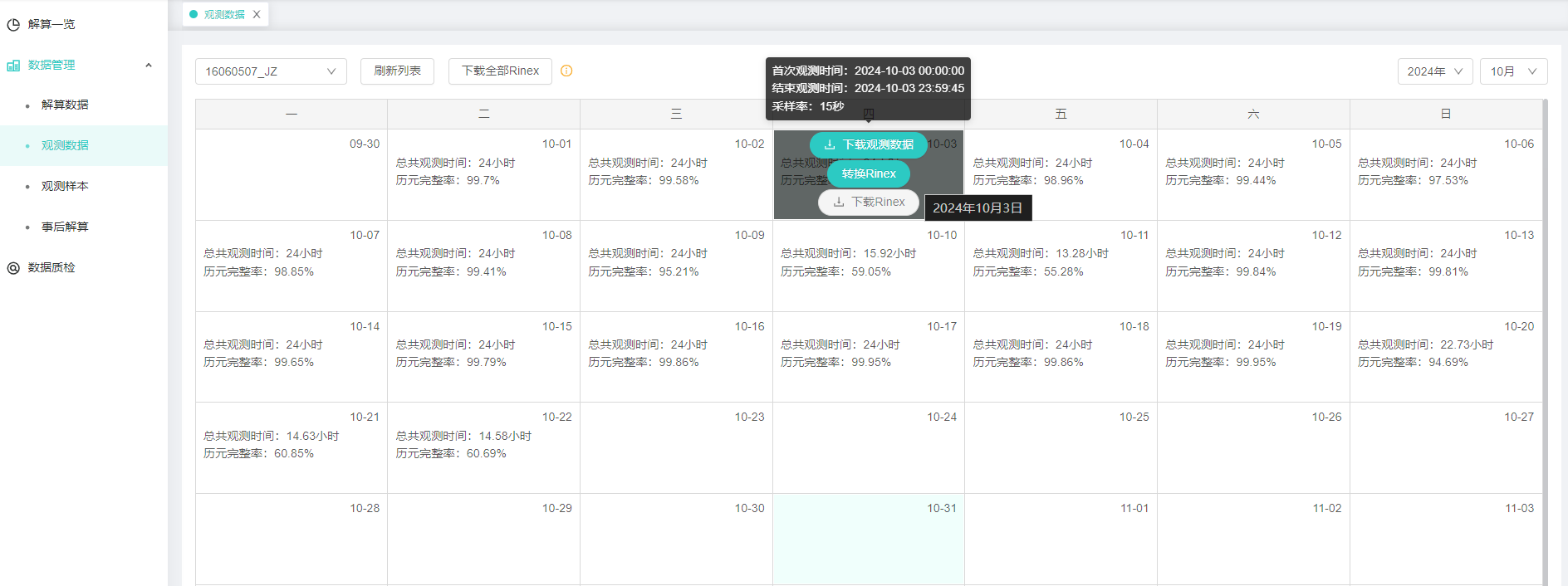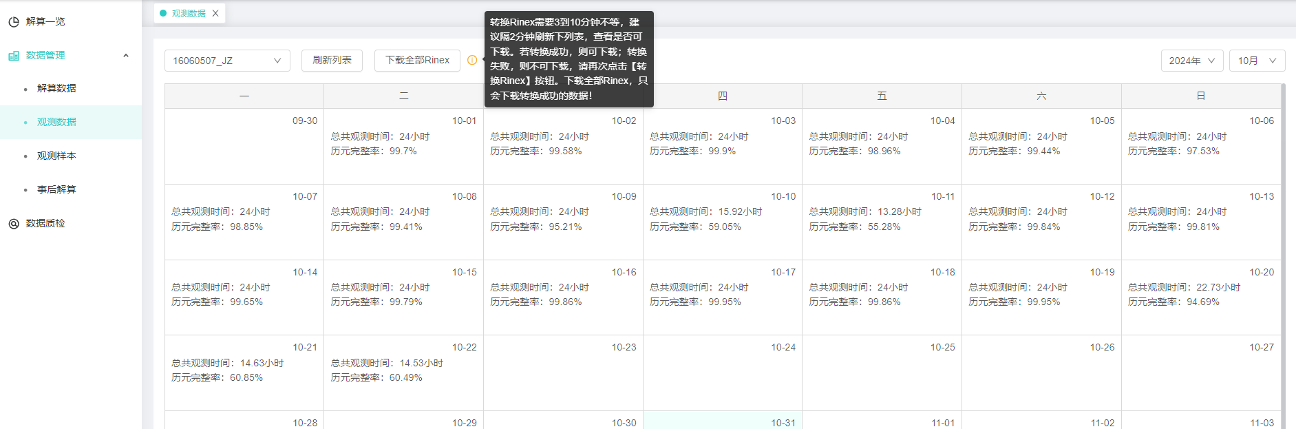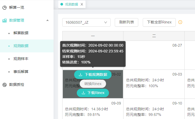 【操作说明】1、选择行业和工程,进入解算中心-数据管理-观测数据,选择站点和时间,点击下载全部Rinex,下载所有转换成功的Rinex数据,未转换成功Rinex的数据不下载。