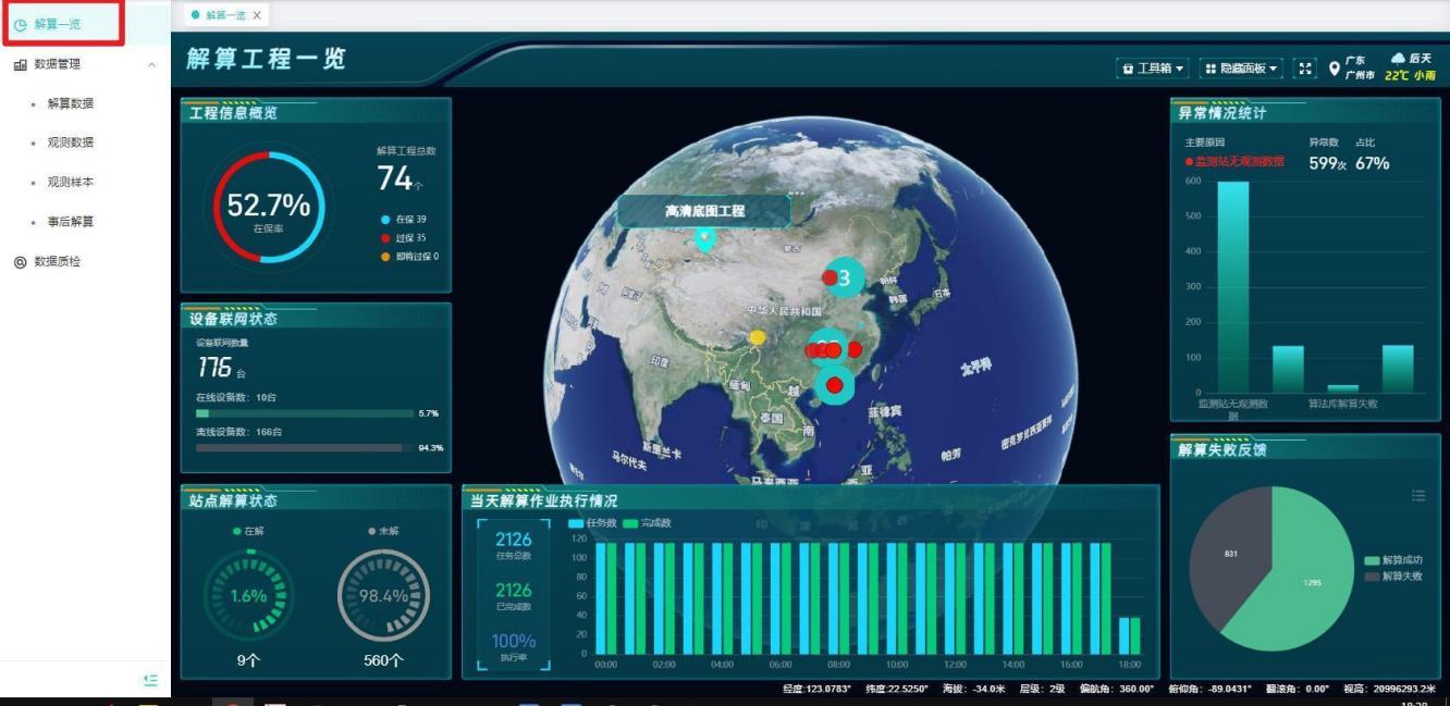 【操作说明】1、用户登录系统后,进入“解算中心”-解算一览,默认展示多工程解算情况,包括工程信息概览、站点解算状态、当天解算完成情况等。