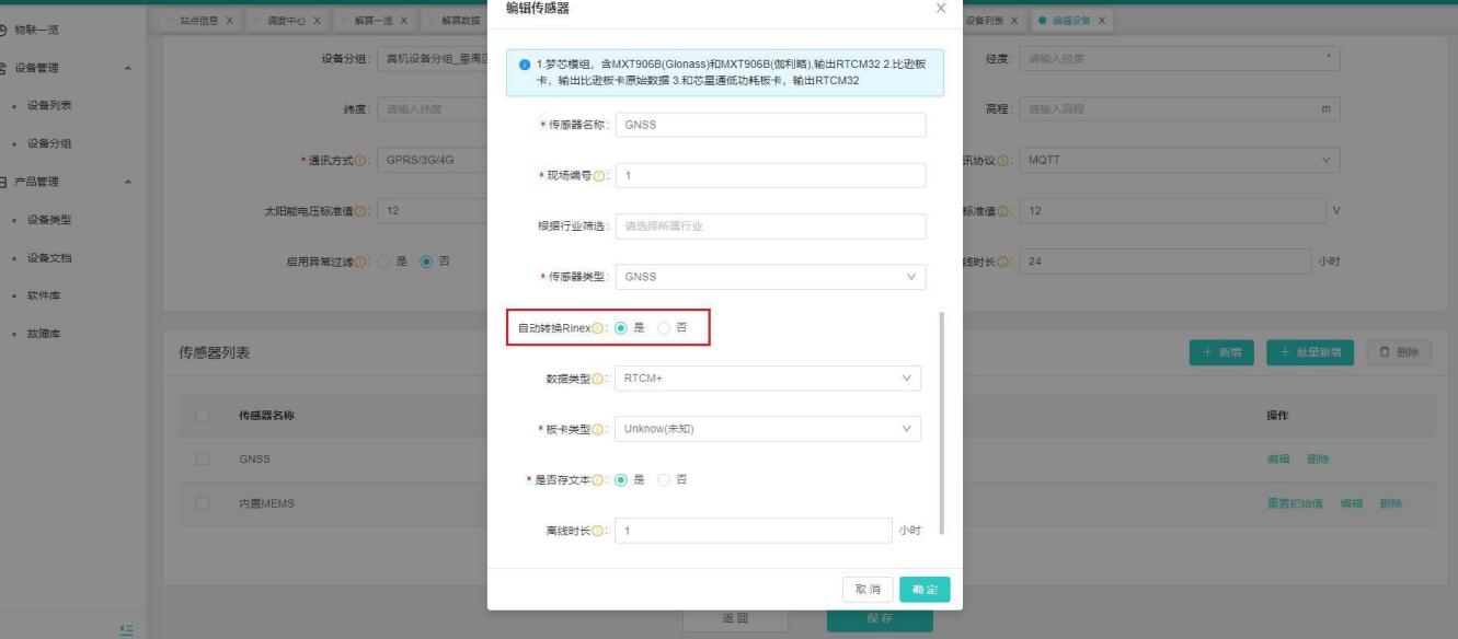 【操作说明】1、进入设备管理-设备列表-设备列表,点击设备后的编辑,点击“GNSS”传感器后的编辑,自动转换Rinex选择“是”。