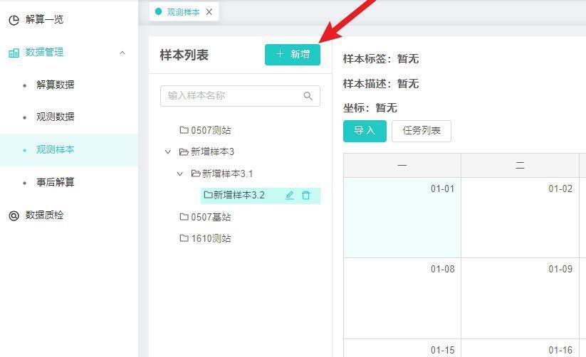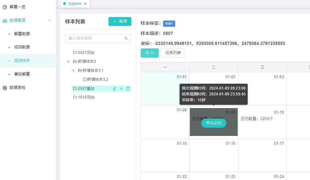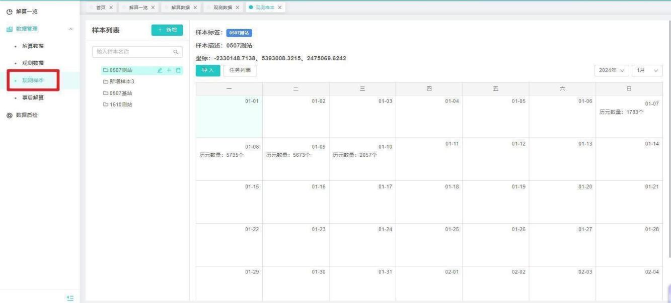 【操作说明】1、打开解算中心-数据管理-观测样本,包含:样本列表、样本标签、样本描述、坐标、导入、任务列表、日历时间。