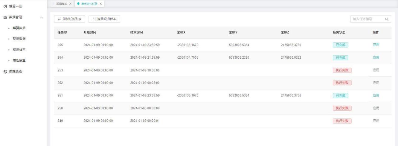 点击单点定位,选择下发单点定位开始和结束的时间,确定下发单点定位解算任务后,进入任务列表中查看。任务完成后可应用单点定位坐标。