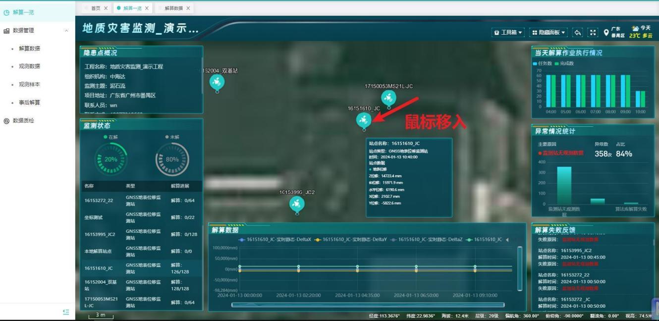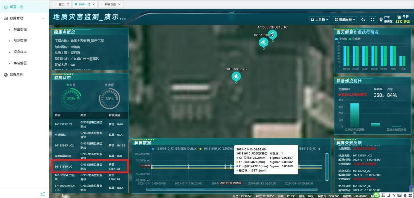 2、可进行【单工程】与【多工程】的切换,单工程大屏展示包含工程概况、监测状态、当天解算作业执行情况、异常情况统计、解算失败反馈等,点击监测站点可展示对应的解算数据。