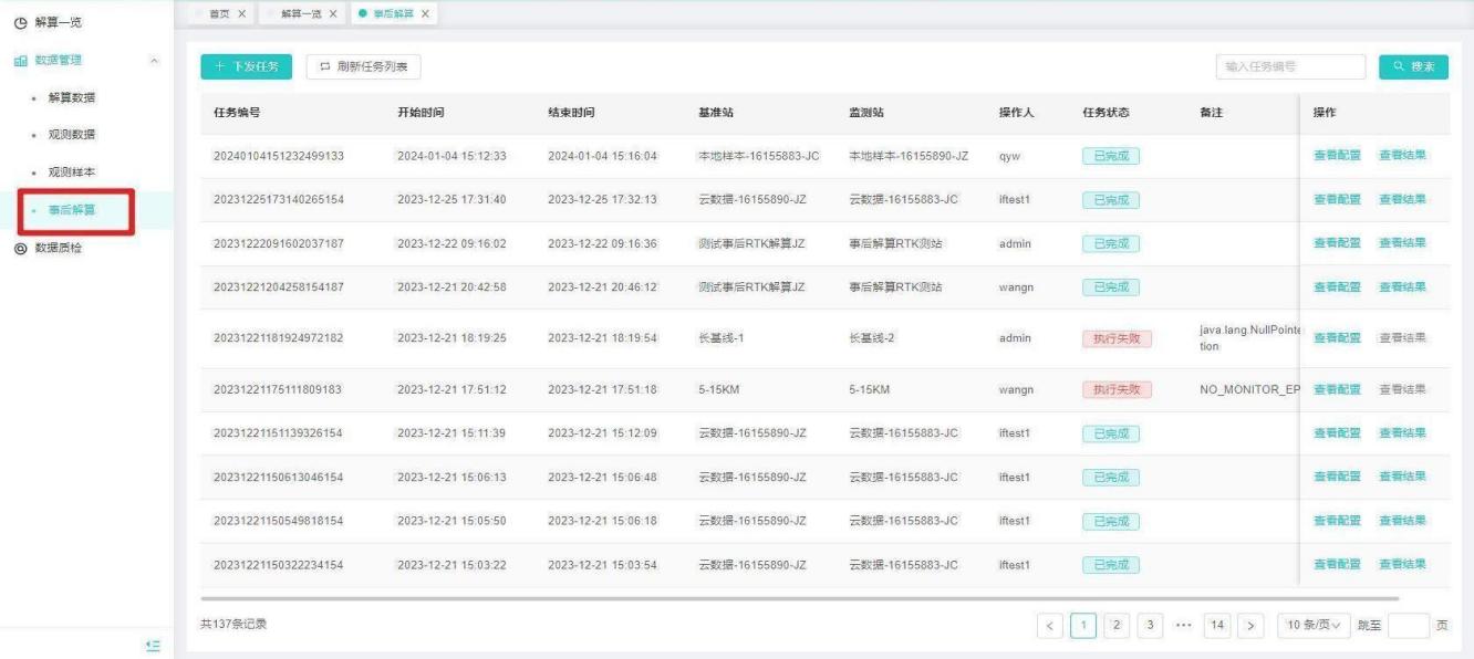 【操作说明】1、打开解算中心-数据管理-事后解算,页面展示包括:下发任务、刷新任务列表、任务编号、开始时间、结束时间、基准站、监测站、操作人、任务状态、备注、操作(查看配置、查看结果)
