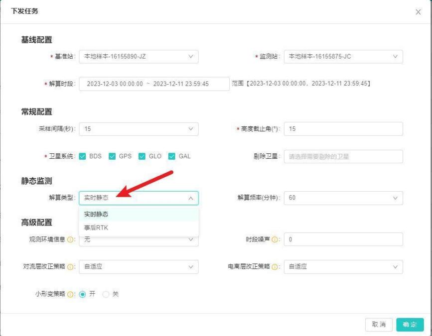 2、点击下发任务。选择基准站和监测站后,默认基站和测站共有的观测时间作为解算时段。解算类型可选择实时静态和事后RTK两种。