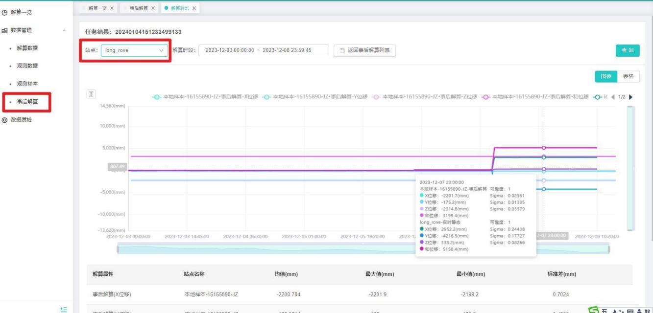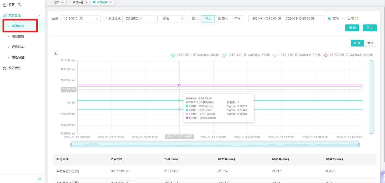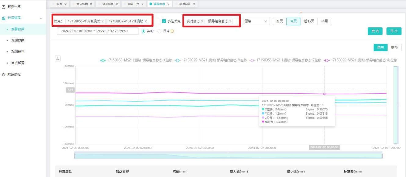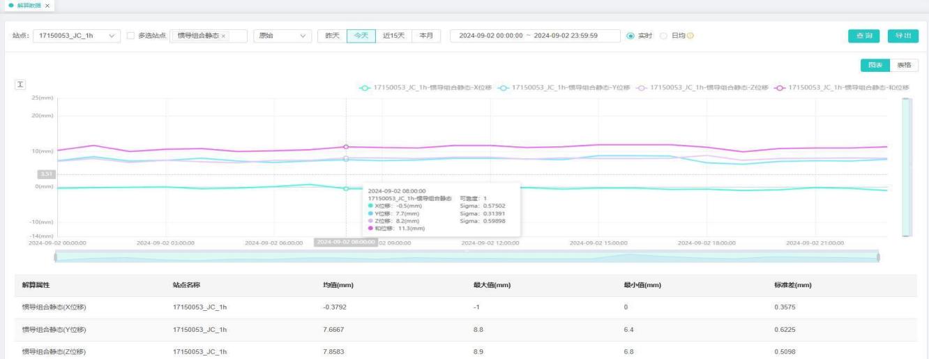 【操作说明】选择行业和工程,选择站点、模式、时间,点击【查询】按钮,展示对应的解算结果,和图表信息。如下图所示: