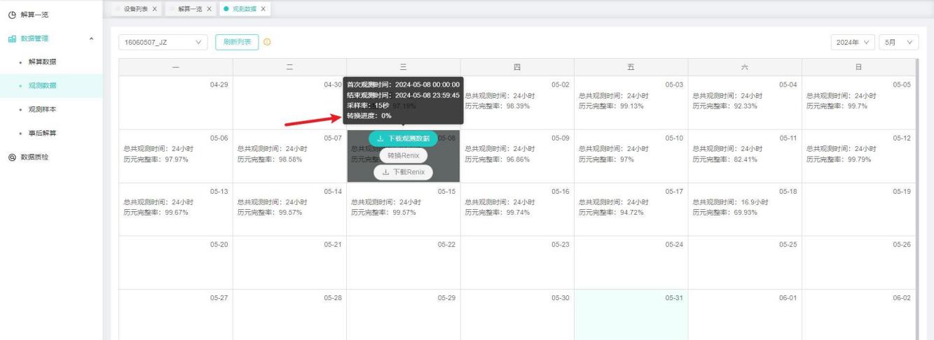 2、点击转换Renix,可将原始观测文件在线转换成O、P文件。刷新列表将鼠标置于转换日期日历格中,可查看转换进度。