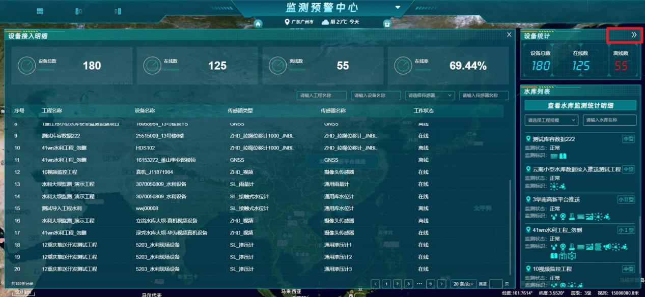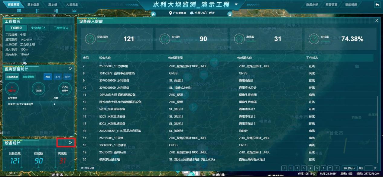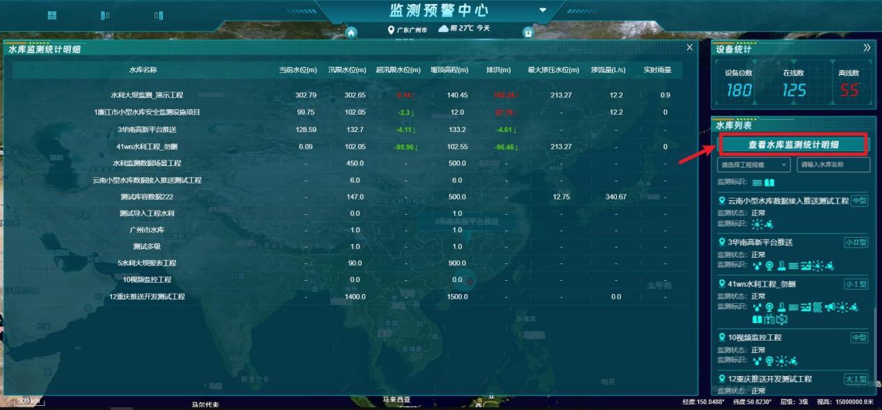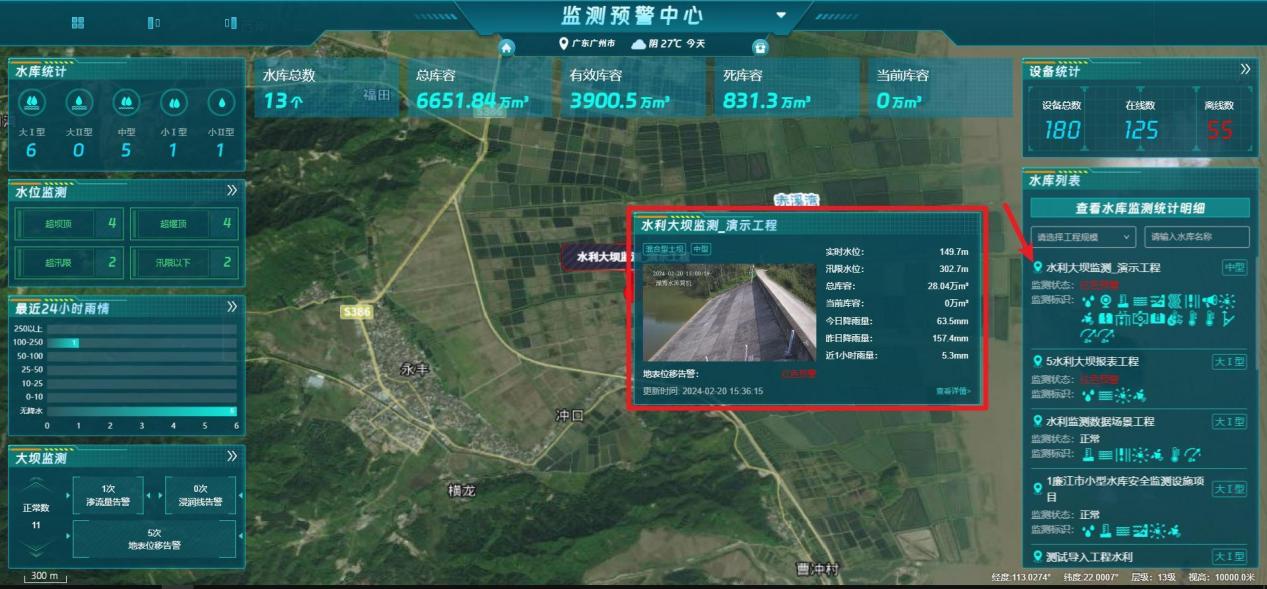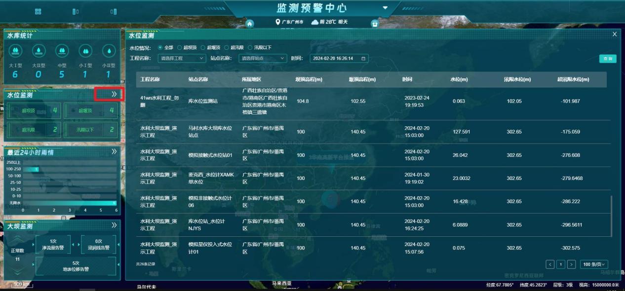 【功能说明】水利工程详细数据内容展示,如:水库统计、水位监测、最近24小时雨情、大坝监测、设备统计、水库列表、库容信息等重要数据