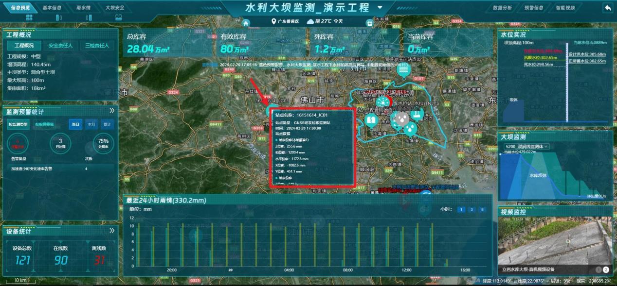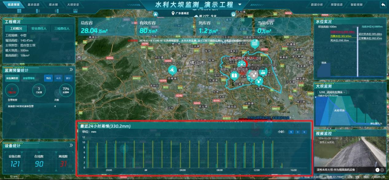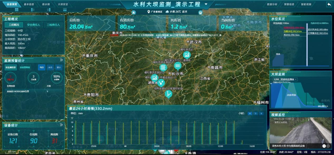 【功能说明】水利GIS单工程大屏展示信息,包含:工程概况、监测预警统计、设备统计、水位实况、大坝监测、视频监控。
