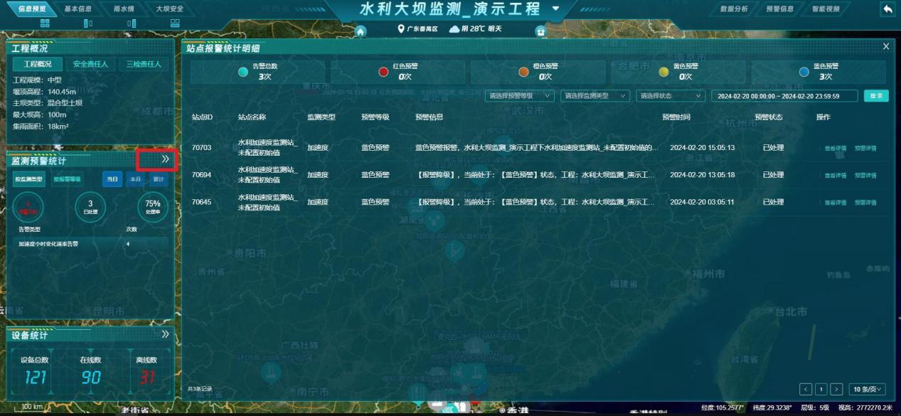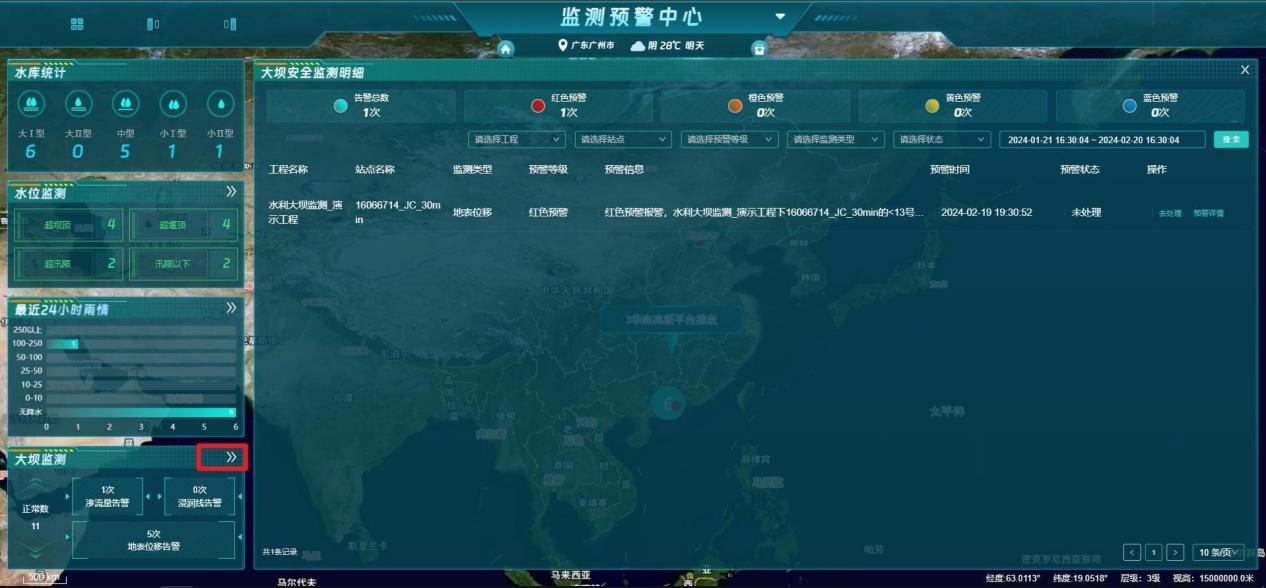 - 汇总展示【地灾、矿山、水利、梁】4个行业的监测预警总数;