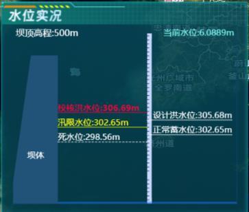 - 水位实况:显示当前水库工程水位数据:堰顶高程、汛限水位、设计洪水位、正常蓄水位、校核洪水位、死水位、当前水位;